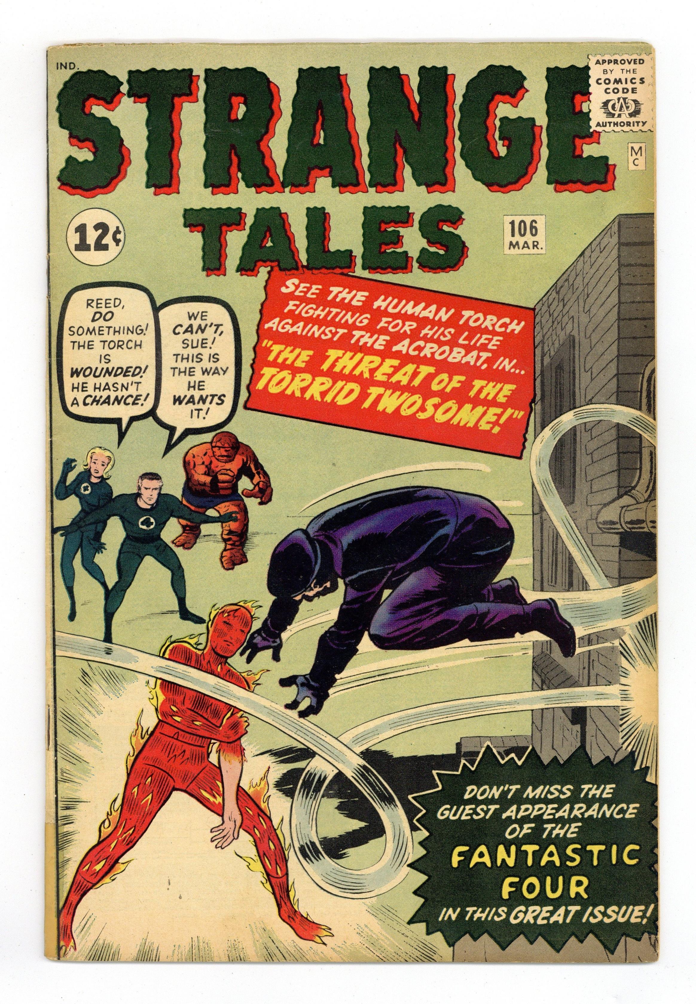 Cover pencils by Jack Kirby, inks by Dick Ayers. The Human Torch stars in "The Threat of the Torrid Twosome," script by Stan Lee (plot) and Larry Lieber (script), art by Dick Ayers; The Acrobat tricks the Human Torch into helping him rob a bank before double crossing him; The Torch chases and captures the thief with the help of the Fantastic Four. "The Recipe" text story. "Man on the Scaffold!", script by Stan Lee, art by Steve Ditko; A teller of tall tales becomes the butt of some ribbing when he tries to tell his fellow painters that he has acquired some magic paints. "The Mystery of the Purple Planet!", script by Stan Lee (plot) and Larry Lieber (script), art by Paul Reinman; A space expedition is sent to a distant planet when it is suddenly covered with an artificial mist; The team finds gold and takes it, but are transformed into aliens like the inhabitants. 36 pgs., full color. Cover price $0.12. Grade: GD/VG 3.0 explanation of grade Condition: Used (collectible)