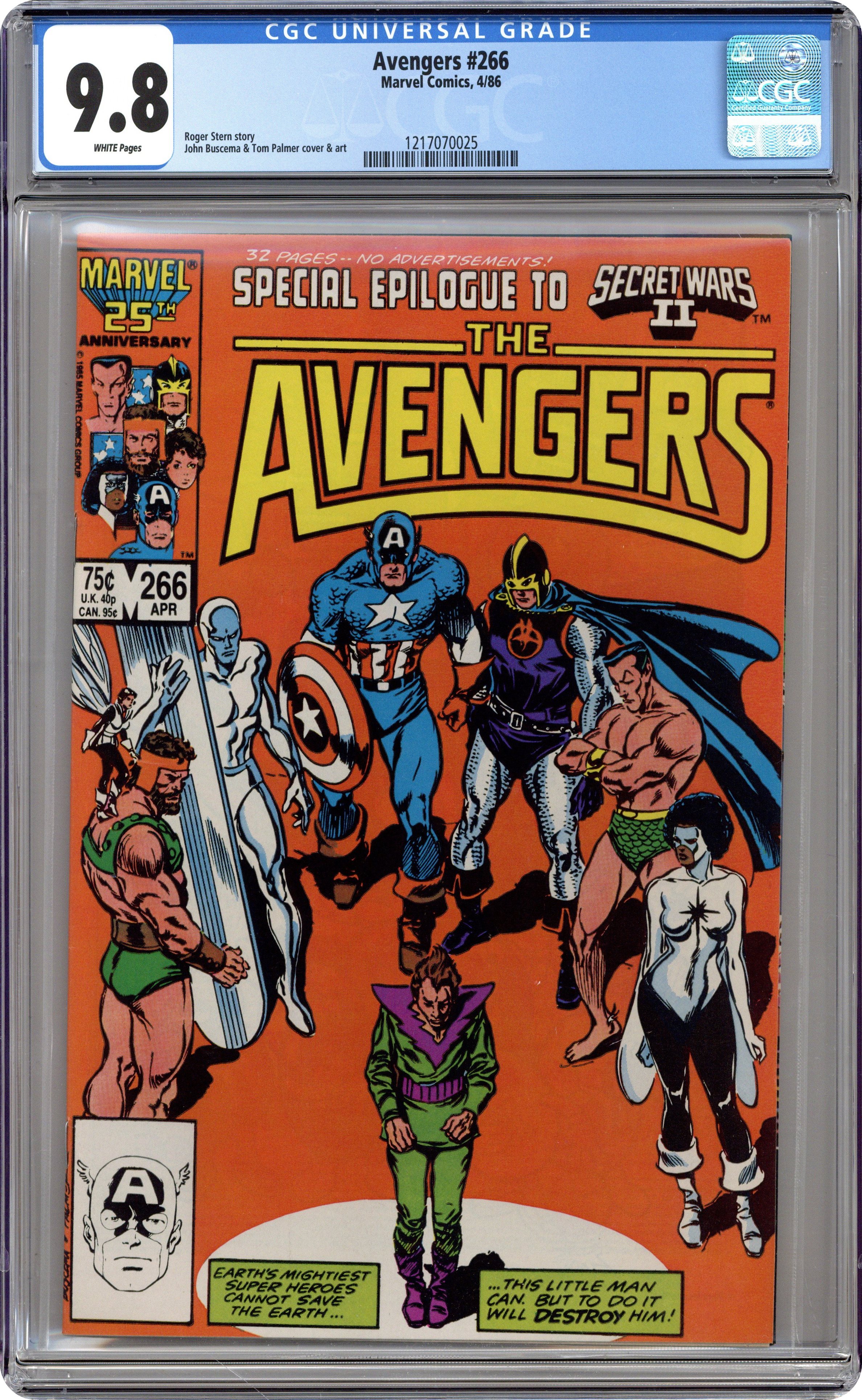 Ended Jul 4 2023 Winning Bid $56 "And the War's Desolation!" Secret Wars II epilogue. Guest-starring the Fantastic Four and the Silver Surfer. Script by Roger Stern and Jim Shooter (additional dialogue). Art by John Buscema (breakdowns) and Tom Palmer (finishes). Cover by John Buscema and Tom Palmer. Story continues from Secret Wars II Limited Series issue 9. The mightiest super-heroes on the planet have stopped the Beyonder! But the victory may be a pyrrhic one as the Earth's crust has sustained major damage! The massive chasm in the Colorado Rockies threatens to cause a geophysical catastrophe! However, some of the most powerful beings in the universe including the Silver Surfer and the Molecule Man are on hand to try to prevent global disaster! But first Reed Richards and Captain America must convince Owen Reece to risk his life for the rest of mankind. And then it's up to the power cosmic! Can the Molecule Man and the Silver Surfer rebuild an entire mountain range? They must! Otherwise, it's rebuild another Earth! Avengers Lineup: Black Knight, Captain America, Captain Marvel, Hercules, Sub-Mariner, and the Wasp. (Notes: There are not any advertisements in this issue. 32 pages of story and art plus letters. The letters page contains a statement of ownership: average print run 408,705; average paid circulation 241,966.) 36 pages Cover price $0.75. Grade: CGC 9.8 explanation of grade Condition: Used (collectible)