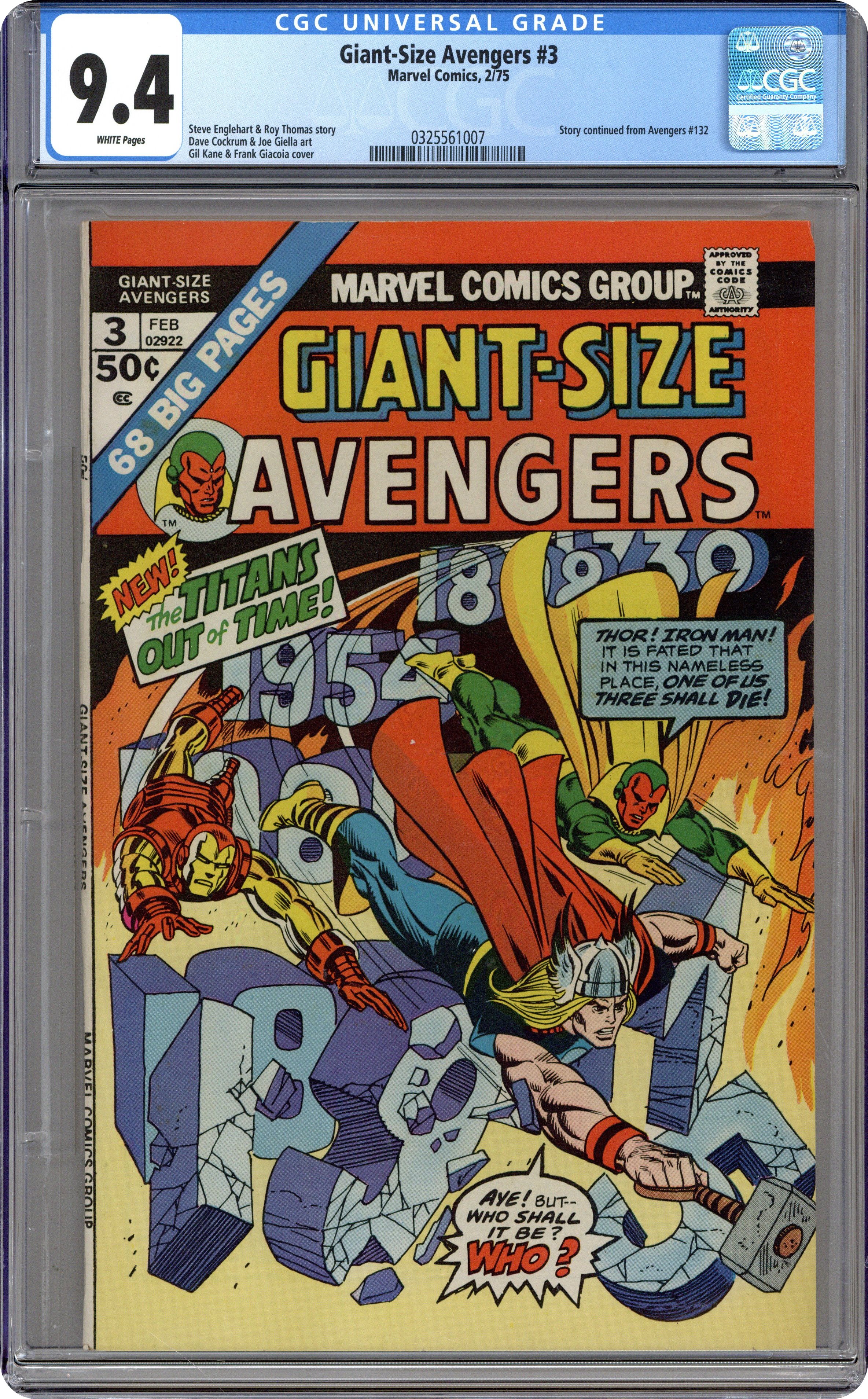 Ended Apr 29 2023 Winning Bid $89 "What Time Hath Put Asunder!" Script by Steve Englehart. Art by Dave Cockrum and Joe Giella. Cover by Gil Kane and Frank Giacoia. The story continues from Avengers 132 and finds the Avengers in the midst of a desperate battle in Immortus' Labyrinth of Limbo! The golden avenger has perished and the Vision appears mortally wounded! Only Hawkeye, Mantis, and Thor remain to fight Kang's Legion of the Unliving! However, the battle begins to turn, when two members of Kang's legion, Frankenstein's Monster and the original Human Torch, have second thoughts about fighting the Avengers! If Hawkeye can defeat Baron Zemo and then free Rama-Tut and Immortus, the good guys might just win! Story continues in Avengers 133. Backup story: Reprint of Avengers 2 (1st series) featuring the Space Phantom. (Notes: This issue features a fierce battle between the Vision and Wonder Man (one of the Legion of the Unliving). Wonder Man returns in Avengers 151. The original Human Torch appears next in Avengers West Coast 50. The letters page contains Marvel Value Stamp series A #41 the Gladiator.) 68 pages Cover price $0.50. Grade: CGC 9.4 explanation of grade Condition: Used (collectible)
