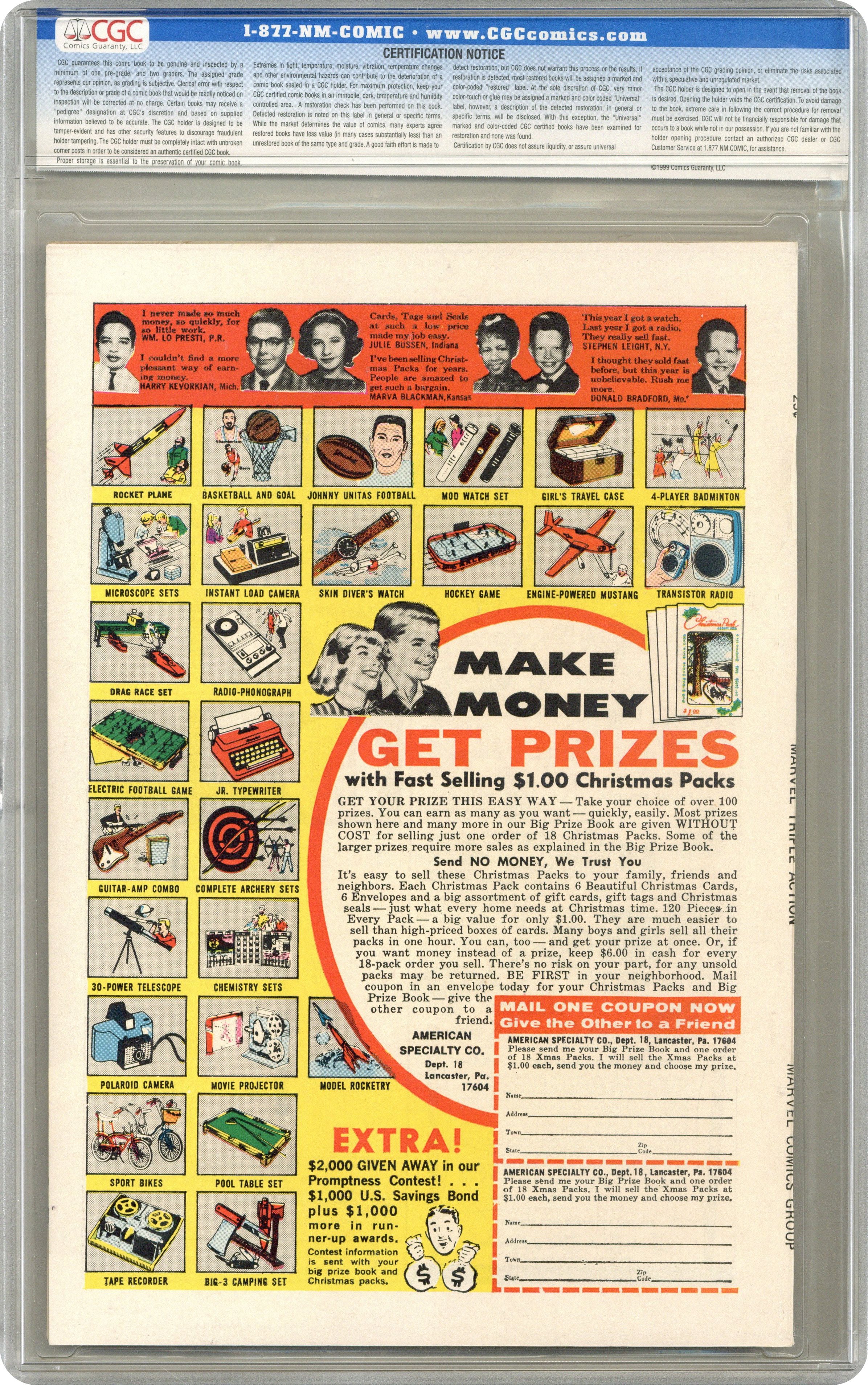 Cover pencils by John Buscema, inks by Frank Giacoia. "When Strikes the Silver Surfer," script by Stan Lee, pencils by Jack Kirby, inks by Joe Sinnott; Filled with jealousy, Ben attacks the Silver Surfer; "Enter Dr. Doom," script by Stan Lee, pencils by Jack Kirby, inks by Joe Sinnott; While Sandman attempts to free the Wizard, Dr. Doom steals the Surfer's Power Cosmic; Originally presented in Fantastic Four (1961 1st Series) #55. 68 pgs., full color. $0.25. Cover price $0.25. Grade: CGC 9.6 explanation of grade Condition: Used (collectible)