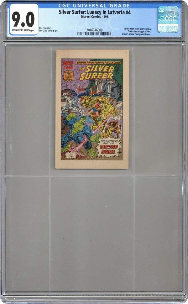 Ended Feb 22 2023 Winning Bid $22 Indicia (The Silver Surfer: Lunacy in Latveria). # 4 of 4 issue limited series. Packaged and given away with Drake's snack cakes. Spider-Man, Wolverine, Hulk, and the Silver Surfer (1993) is a promotional comic book distributed by Drake's Snack Cakes. Script by Eric Fein, pencils by Jim Craig, inks by Dan and David Day. "Lunacy In Latveria" features a team-up with Spider-Man, Wolverine, the Incredible Hulk, and the Silver Surfer, the former herald of Galactus who is empowered with the Power-Cosmic. These unlikely allies must work together to stop the fiendish plot of the diabolical Doctor Doom. 16 pages, full color, 3-in. x 5-in., card stock, with no cover price. Grade: CGC 9.0 explanation of grade Condition: Used (collectible)