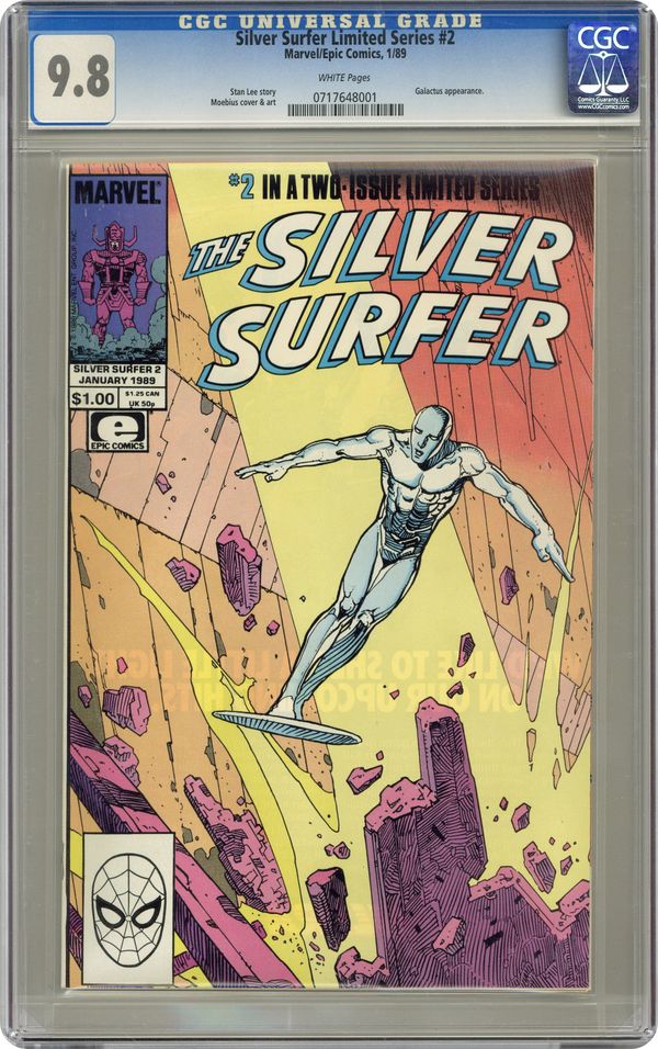 Ended Apr 17 2023 Winning Bid $56 Direct edition. Cover by Moebius. Parable Part 2, script by Stan Lee, art by Moebius; The Silver Surfer decides to fight back and reveals Galactus as an opportunist. 36 pgs., full color. $1.00. Cover price $1.00. Grade: CGC 9.8 explanation of grade Condition: Used (collectible)