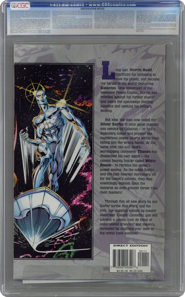 Ended Apr 17 2023 Winning Bid $100 Claudio Castellini unleashes the Silver Surfer! It's a space saga with art so awesome it will make grown men weep. This 48-page epic has it all: Galactus, Thanos, Skrulls, stellar scripting by Ron Marz, and visuals that will burn holes in your corneas! Written by Ron Marz. Art and cover by Claudio Castellini. Cover price $3.95. Grade: CGC 9.8 explanation of grade Condition: Used (collectible)