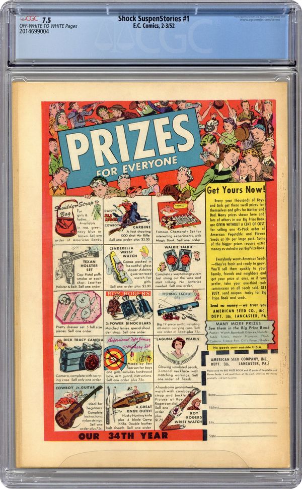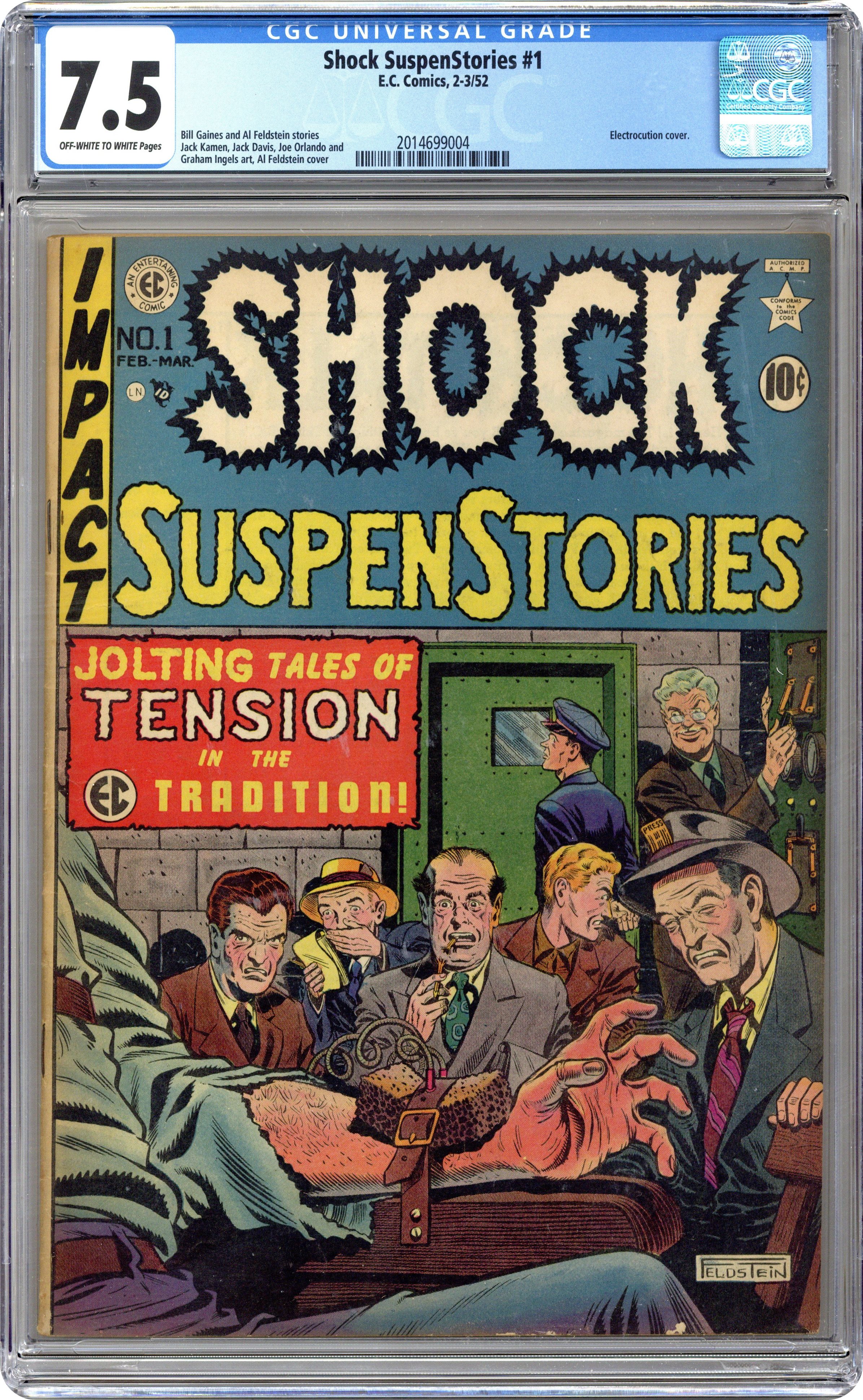 Ended Oct 17 2023 Winning Bid $710 Cover art by Albert B. Feldstein. The Neat Job!, script by Bill Gaines (co-plot) and Albert B. Feldstein (co-plot, script), art by Jack Kamen; An abused housewife married to a neat freak snaps one day and neatly dices the sections of her husband's body into small jars. Yellow!, script by Bill Gaines (co-plot) and Albert B. Feldstein (co-plot, script), art by Jack Davis; A Colonel's son faces the firing squad for cowardice under fire, and is court-martialed and found guilty, sentenced to die by firing squad. Alibi! text story by Albert B. Feldstein. The Monsters!, script by Bill Gaines (co-plot) and Albert B. Feldstein (co-plot, script), pencils by Joe Orlando, inks by Joe Orlando; Aliens deposit their mutant births on Earth which, to them, appear as horrible monsters, but appear as regular human beings to the Earth men. The Rug!, script by Ball Gaines (co-plot) and Albert B. Feldstein (co-plot, script), art by Graham Ingels (as Ghastly); Conrad and his friend Reggie head up to the big woods for some relaxation, as well as going hunting for a grizzly bear. 36 pgs. $0.10. Cover price $0.10. Grade: CGC 7.5 explanation of grade Condition: Used (collectible)