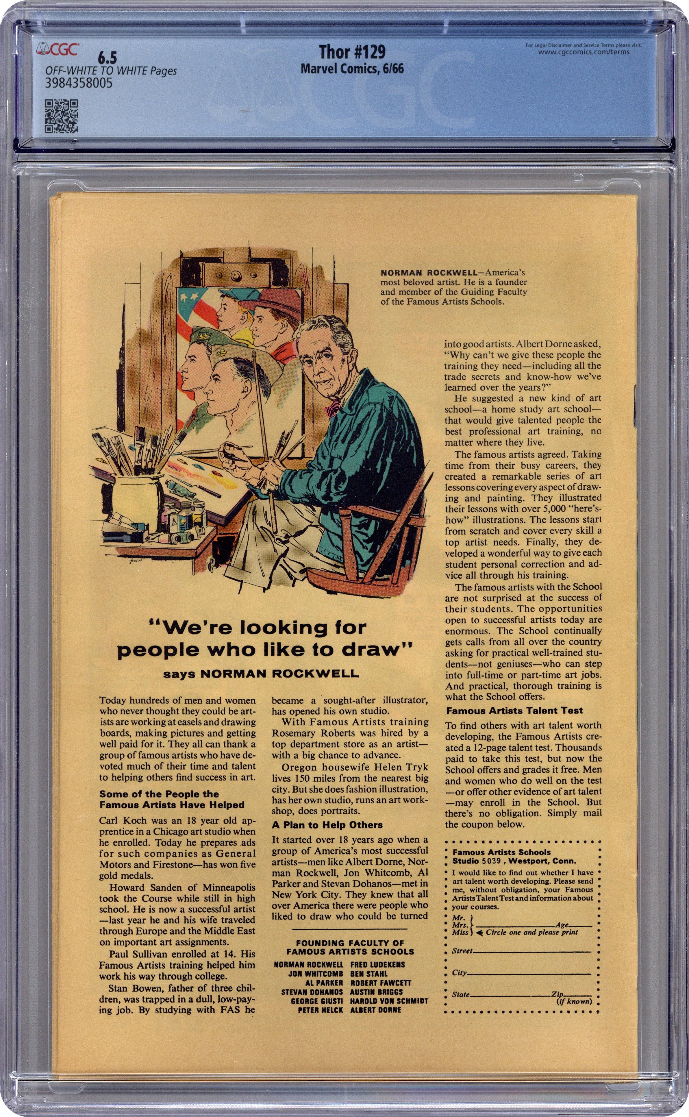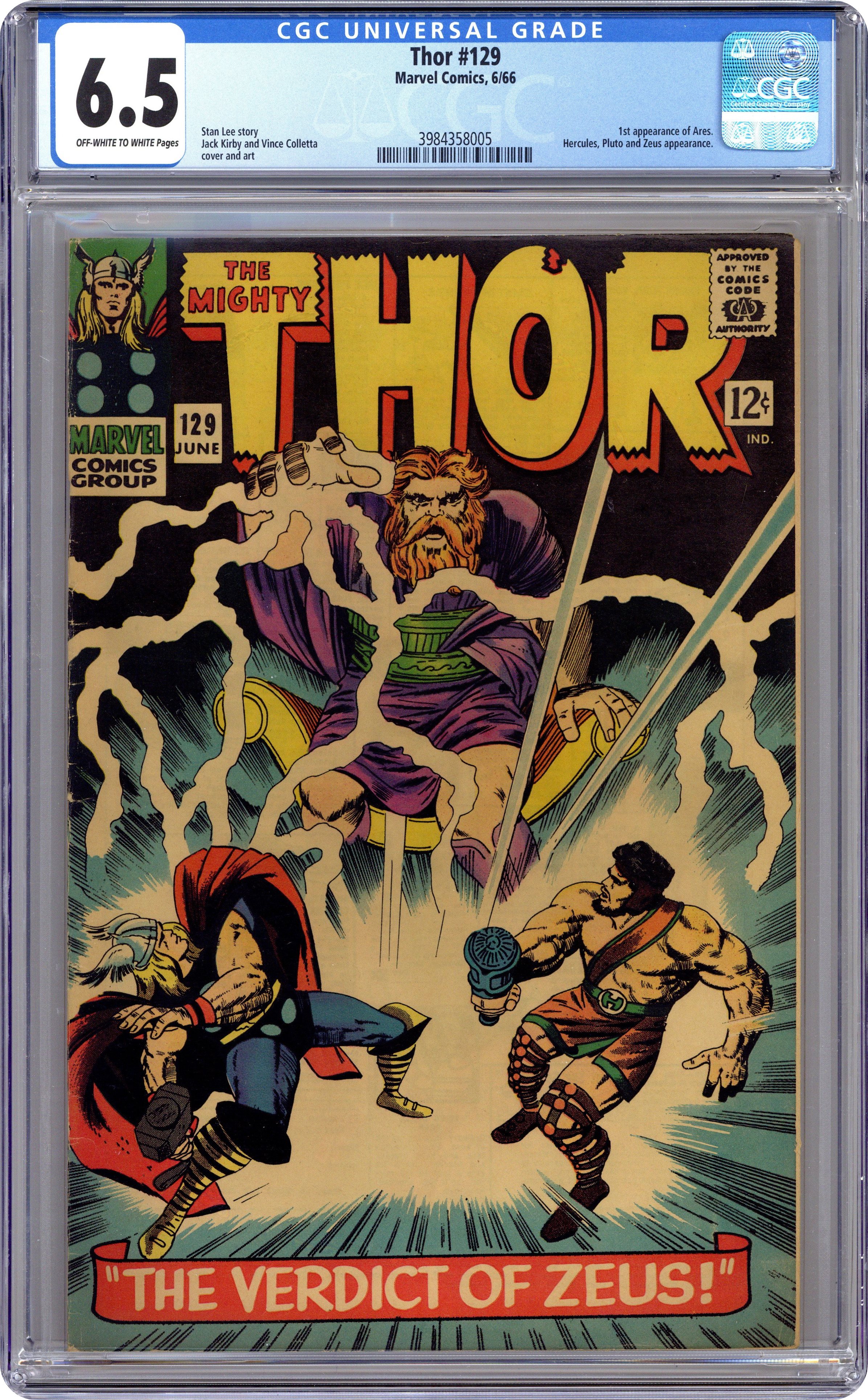 Cover pencils by Jack Kirby, inks by Vince Colletta. 1st appearance of Ares in Marvel Universe in "The Verdict of Zeus!", script by Stan Lee, pencils by Jack Kirby, inks by Vince Colletta; Thor resolves to give up his immortality to be with Jane Foster, however it is The Day of Three Worlds, and he must honor an ancient prophecy before he can appeal to Odin; Meanwhile, Hercules desperately searches for anyone who will fight in his name and hopefully prevent his eternal damnation. Appearances by Zeus, Jane Foster, Pluto, and Balder. Tale of Asgard: "The Hordes of Harokin!", script by Stan Lee, pencils by Jack Kirby, inks by Vince Colletta; Thor and companions set out to get the Warlock's Eye that Harokin has seized. Appearances by Hogun, fandrall, and Volstagg. 36 pgs., full color. $0.12. Cover price $0.12. Grade: CGC 6.5 explanation of grade Condition: Used (collectible)