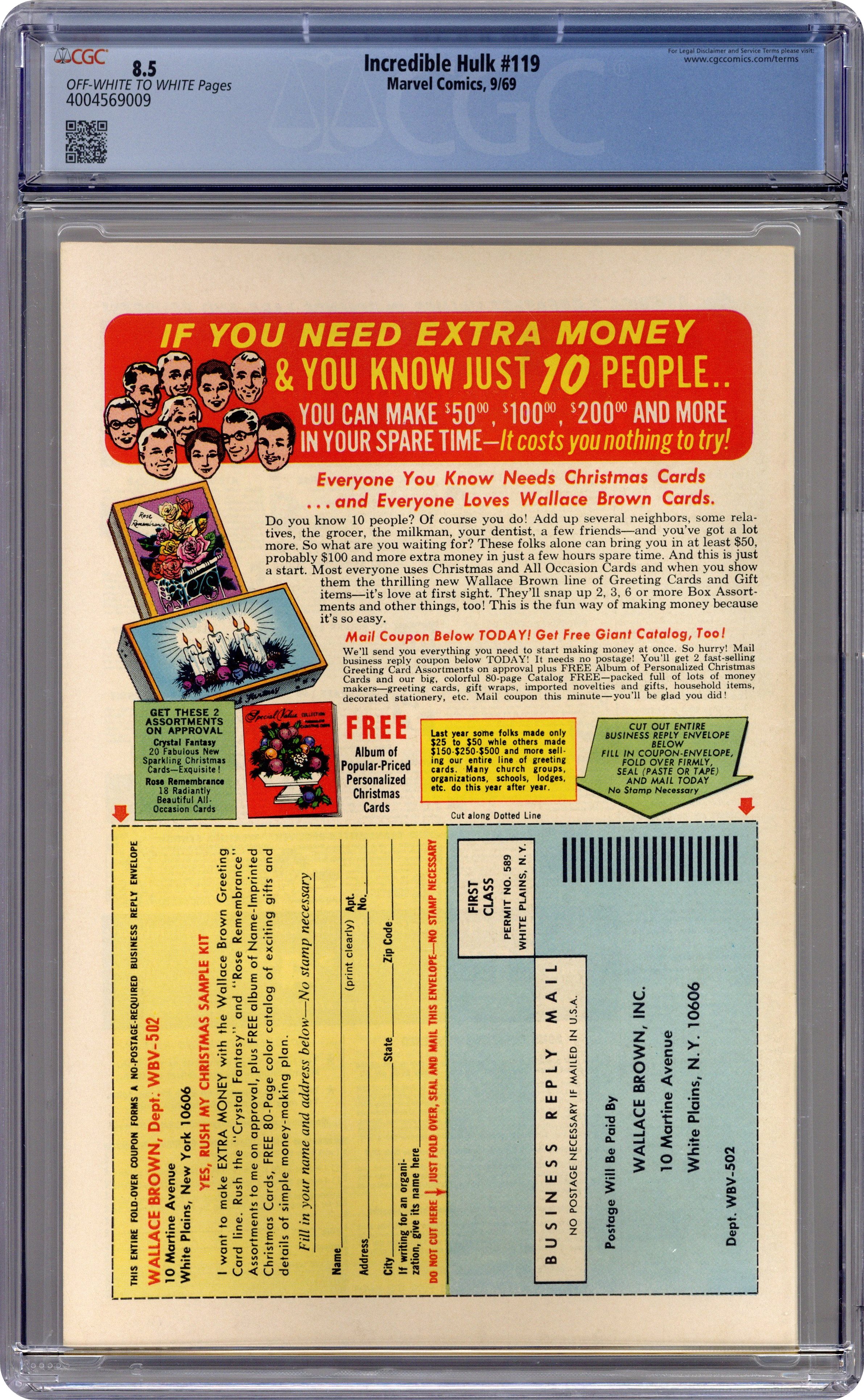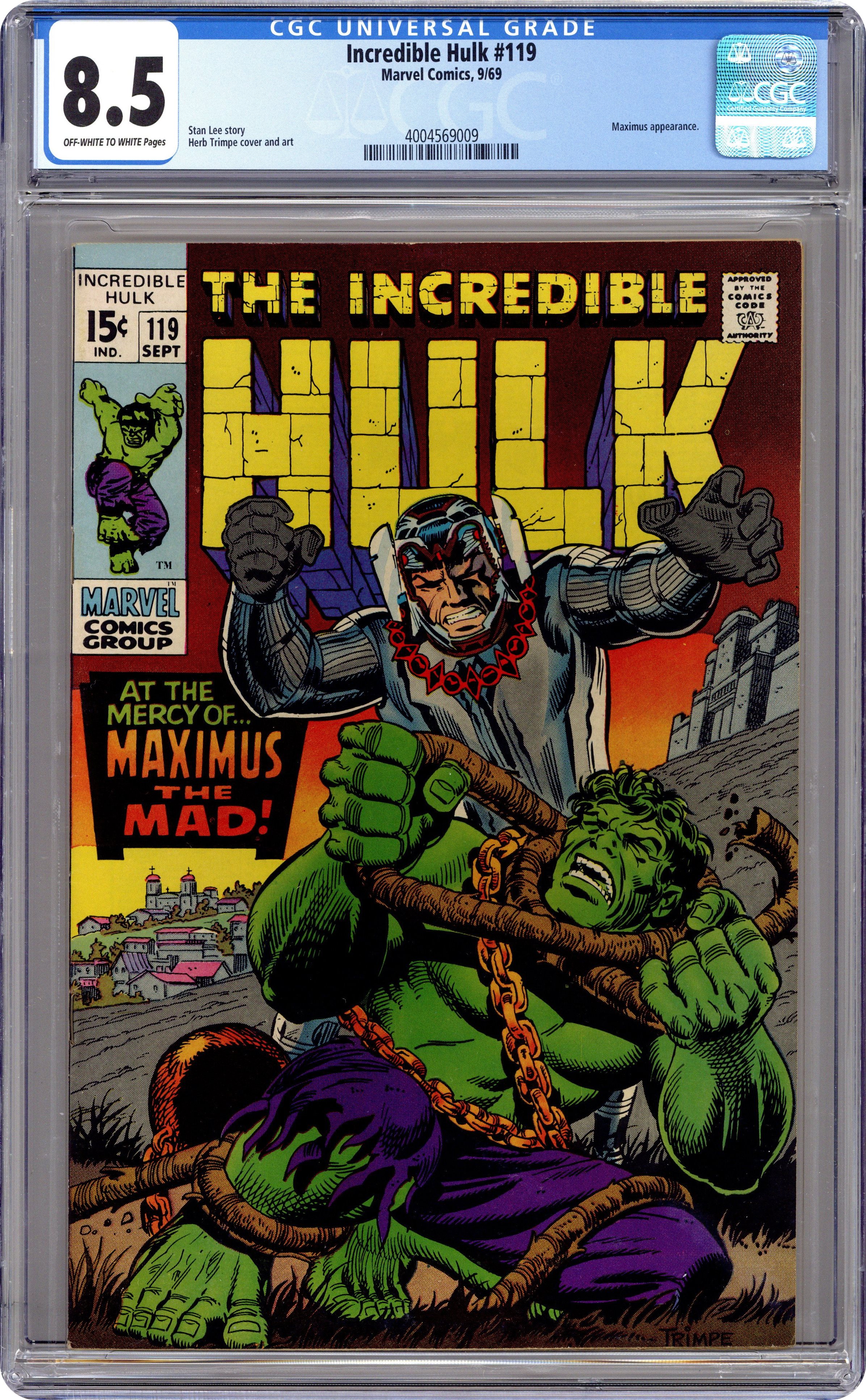 Cover art by Herb Trimpe. At the Mercy of -- Maximus the Mad!, script by Stan Lee, art by Herb Trimpe; Bruce Banner is in the country of Costa Salvador when he runs across a town in the shadow of a giant robot whose inhabitants seem to be mind controlled; As he finds his own mind being assaulted, Bruce turns into the Hulk and then attacks a hilltop fortress that seems to be the source of the mental manipulation; Breaking into the fortress, Hulk finds that his foes are Maximus the Mad and his evil band of Inhumans and a battle ensues; The army also attacks the fortress and Maximus talks the Hulk into helping him repel the jade giant's oldest enemies. 36 pgs. $0.15. Cover price $0.15. Grade: CGC 8.5 explanation of grade Condition: Used (collectible)