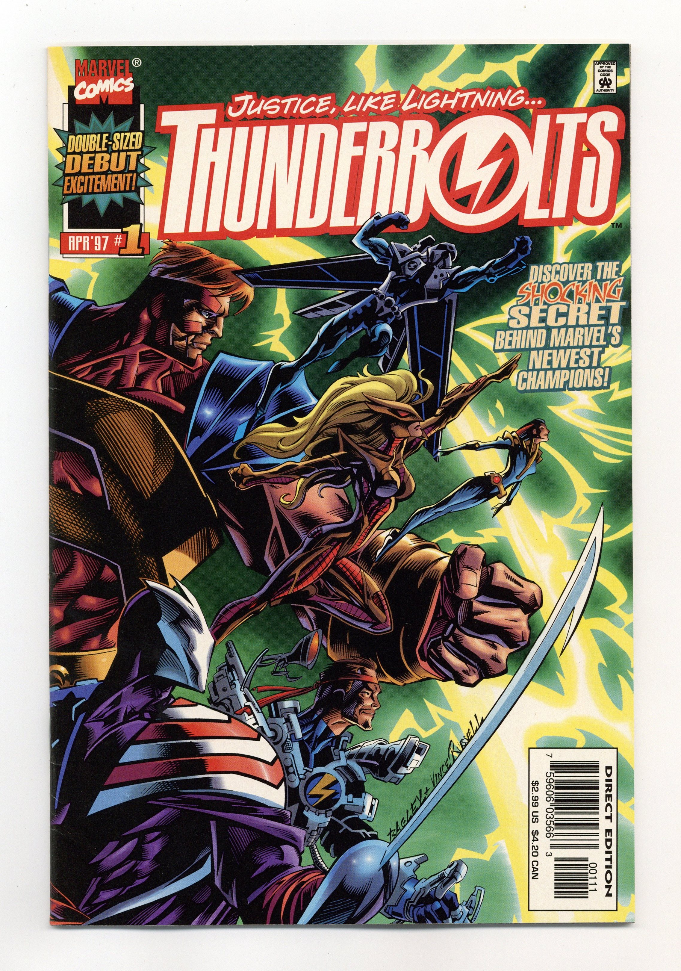 First Printing. Direct Edition. 1st appearance Hallie Takahama (becomes Jolt). Pencils by Mark Bagley, inks by Vince Russell. Justice ... Like Lightning!, script by Kurt Busiek, pencils by Mark Bagley, inks by Vince Russell; Earth's newest heroic team, the Thunderbolts, bursts on the scene to widespread acclaim ... but all is not as it seems. 52 pgs.