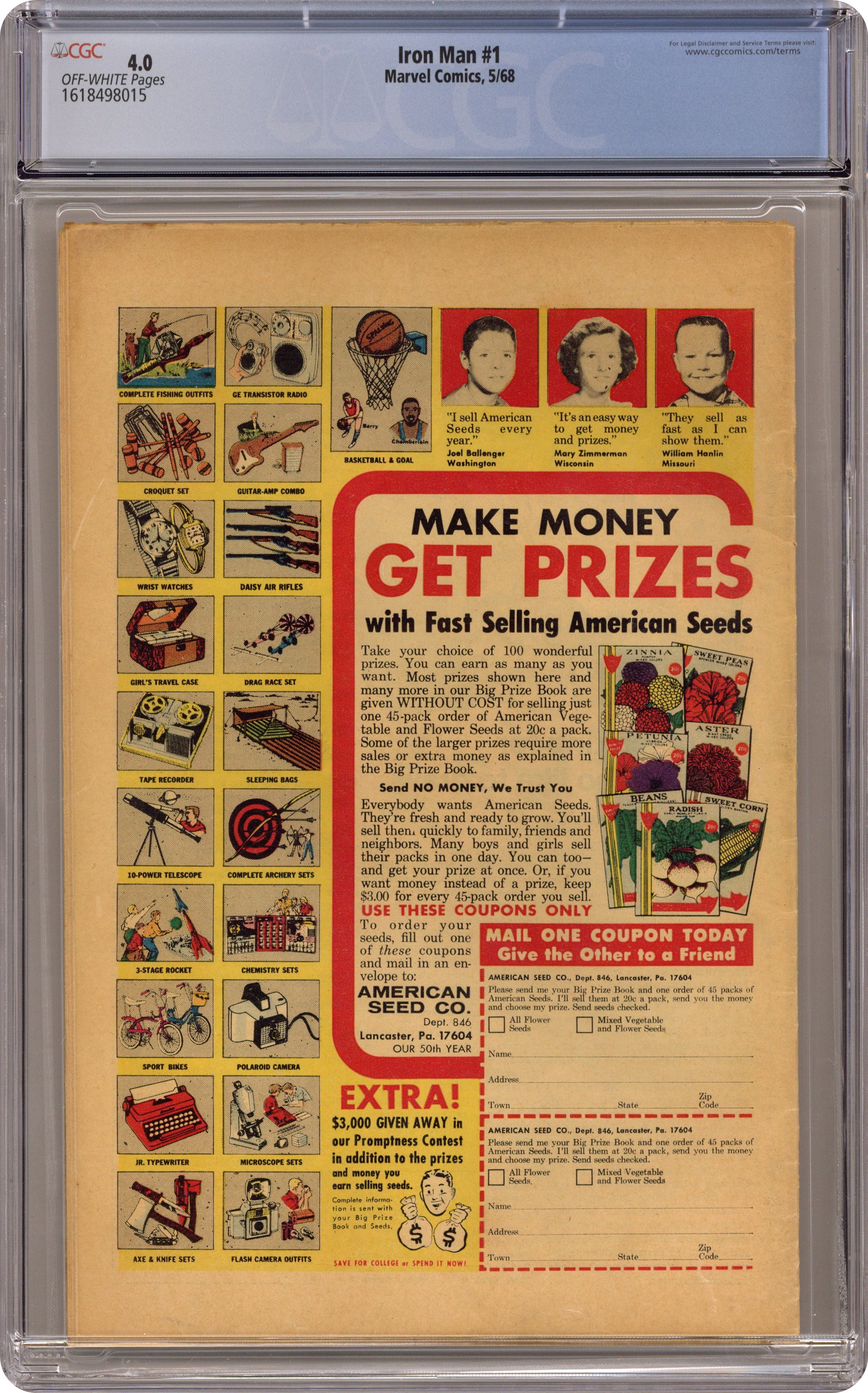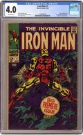 Cover pencils by Gene Colan, inks by Mike Esposito. "Alone Against AIM," script by Archie Goodwin, pencils by Gene Colan, inks by Johnny Craig; Iron Man is captured by A.I.M using a suction beam and trapped in a submarine by orders of Mordius; Meanwhile A.I.M. soldiers are gloating about how they have sunk The Maggias gambling ship and destroyed their leadership; The Golden Avenger is knocked out by gas while back on the sinking Maggia ship Jasper Sitwell is evacuating the passengers; Sitwell stumbles upon Whitney Frost whom he recognises from Stark Industries as one of Tonys admirers; Sitwell rescues Frost and they are taken aboard a S.H.I.E.L.D. helicopter where Nick Fury awaits; When alone Frost reveals herself to be The Big M, leader of The Maggia, and her plan to use Sitwell to learn the secrets of Stark Industries. Continued between Iron Man and Sub-Mariner #1 and Avengers #51. "The Origin of Iron Man," script by Archie Goodwin, pencils by Gene Colan, inks by Johnny Craig; An abridged retelling of Iron Man's origin from Tales of Suspense #39. 36 pgs., full color. $0.12. Cover price $0.12. Grade: CGC 4.0 explanation of grade Condition: Used (collectible)