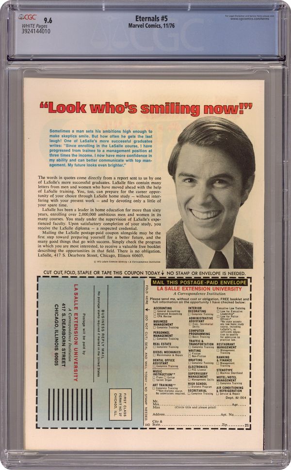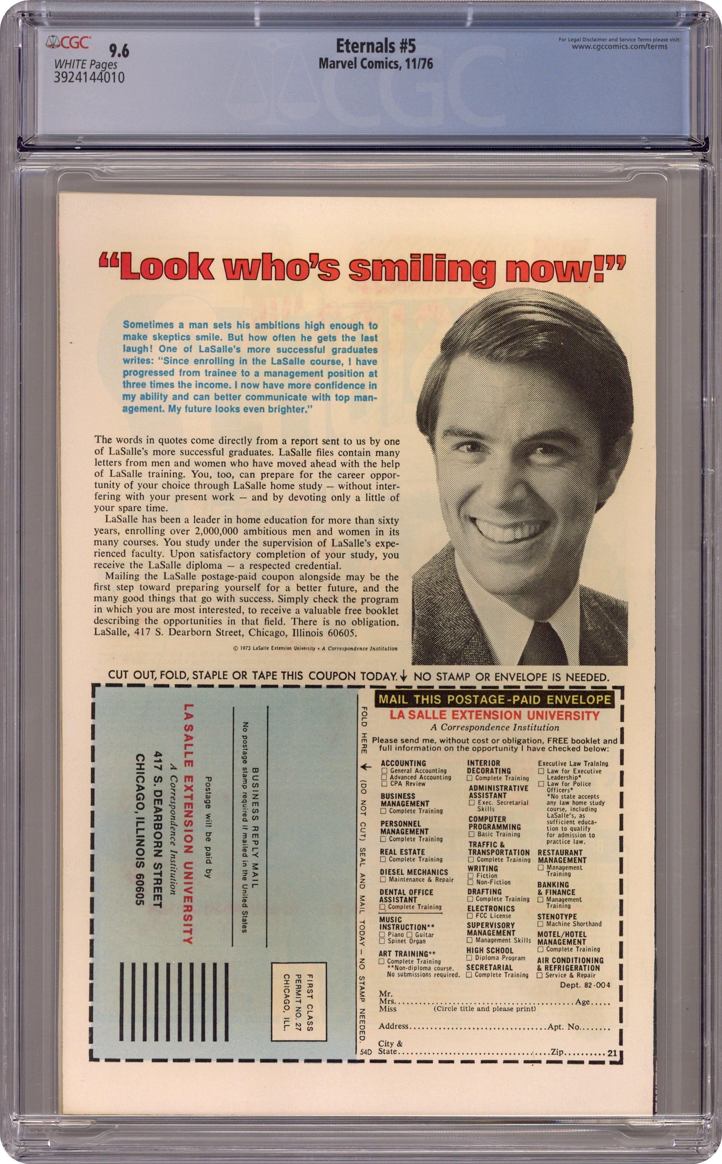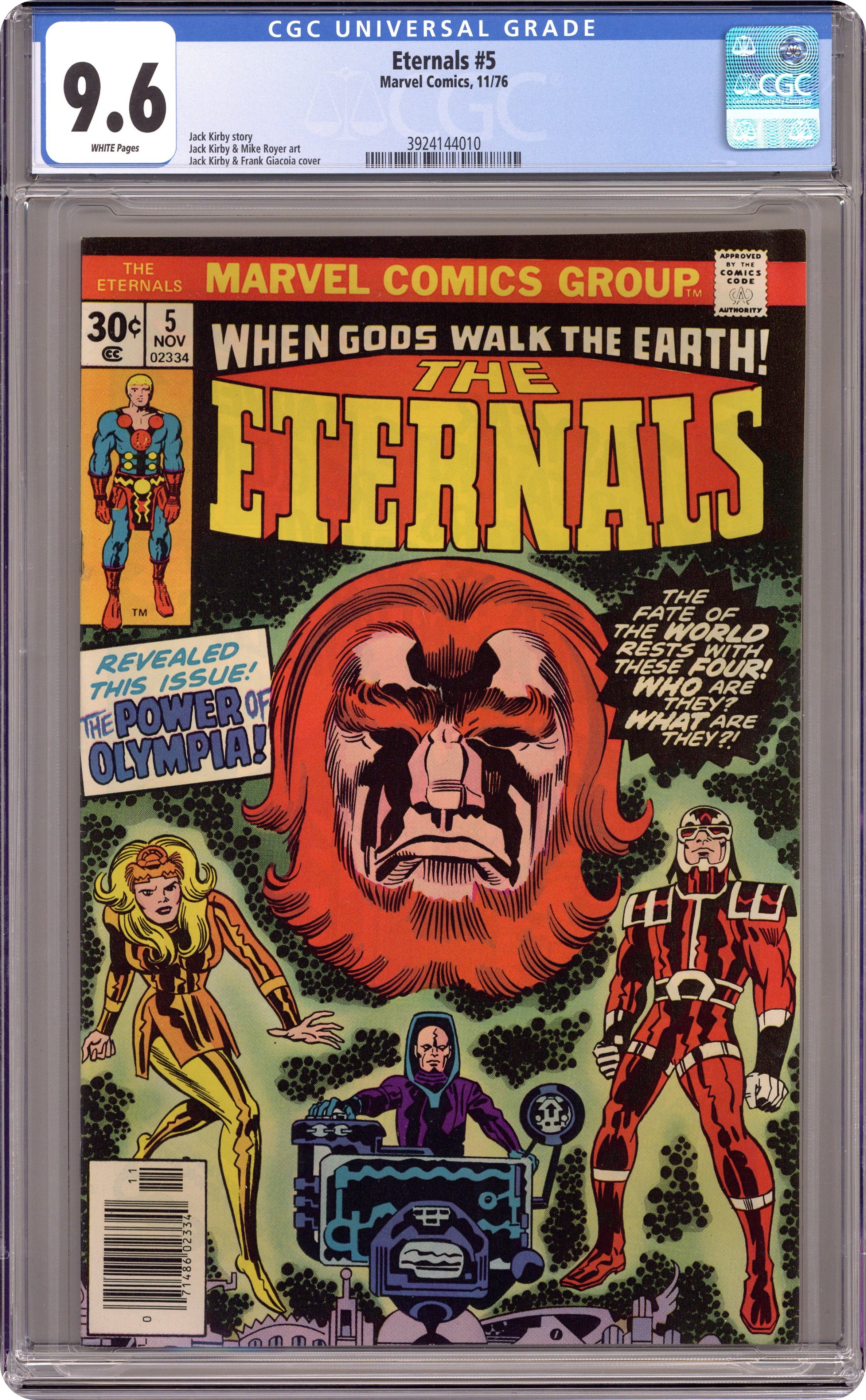 Revealed in this issue--the power of "Olympia!" Written by Jack Kirby. Pencils by Jack Kirby. Inks by Mike Royer. Ikaris has been captured by demonic Deviants, but can even these monsters find a way to kill an immortal? Meanwhile, Makarri and Sersi regroup at the mythical homeland of the Eternals – Olympia! The secret is out! Man has discovered the truth behind mythology...it's all real! Notes: 1st appearance of Domo, Thena, and Zuras. Cover price $0.30. Grade: CGC 9.6 explanation of grade Condition: Used (collectible)
