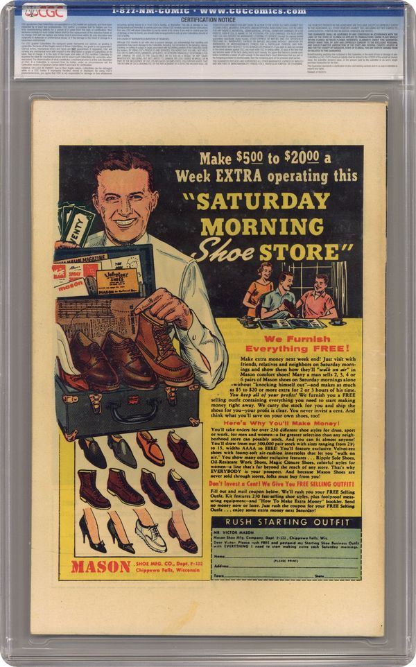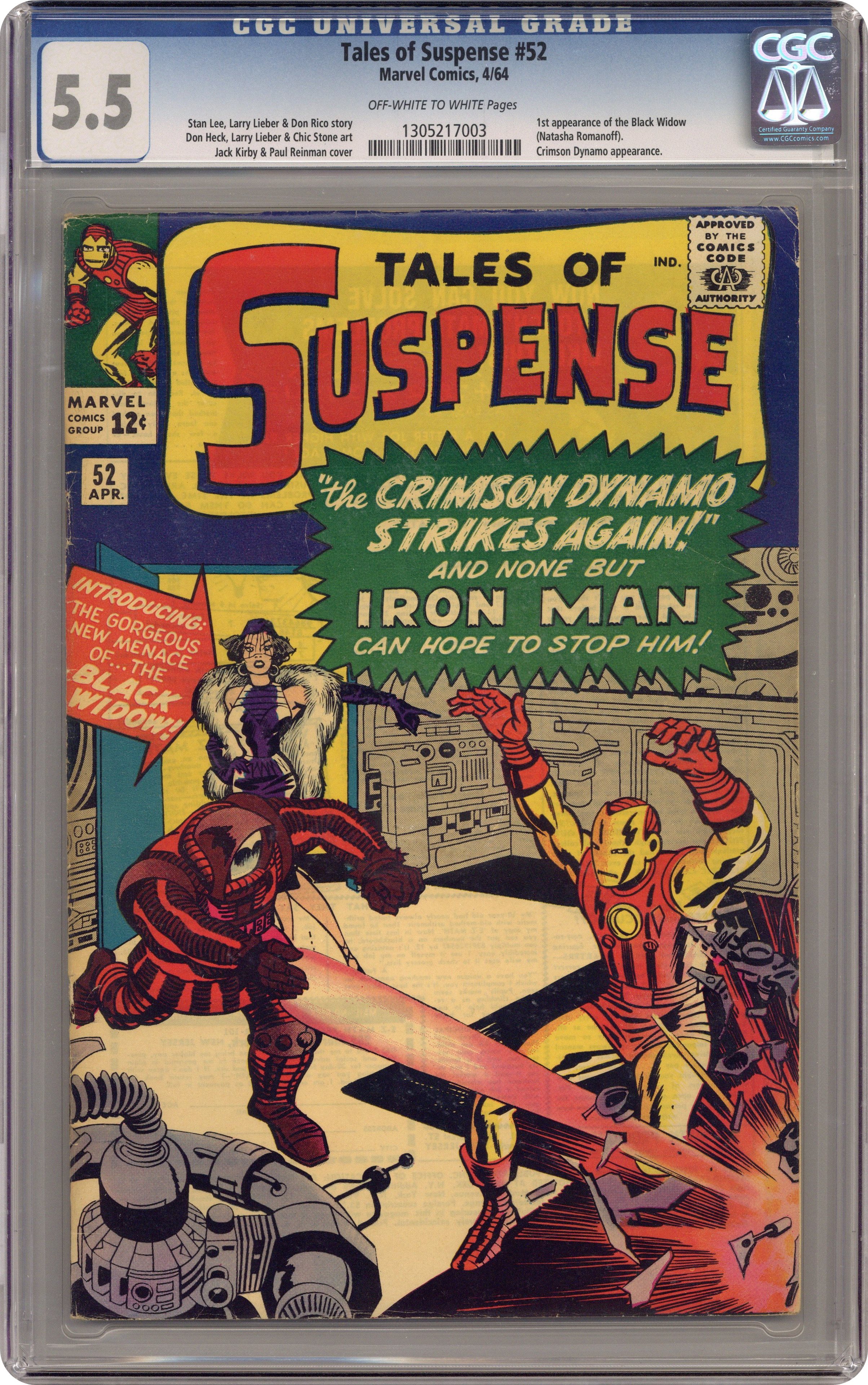 Ended Jul 19 2024 Winning Bid $610 Cover pencils by Jack Kirby, inks by Paul Reinman. First appearance of the Black Widow in "The Crimson Dynamo Strikes Again!", script by Stan Lee (plot) and Don Rico (as N. Korok), art by Don Heck; The Black Widow and Boris are sent to America to kill Anton Vanko, the Crimson Dynamo, for defecting to America; They are also tasked with killing both Iron Man and Tony Stark. The first half of "The Magician" text story. "The Seance!", script by Stan Lee (plot) and Larry Lieber, pencils by Larry Lieber, inks by Chic Stone; A fake medium uses special effects to simulate supernatural powers, but he is taken into the spirit world by real ghosts as punishment. "The Failure!", script by Stan Lee (plot) and Larry Lieber (script), pencils by Larry Lieber, inks by Paul Reinman; The Earth of the future is overwhelmingly materialistic, except for one idealistic young man and his lover; They are abducted by aliens, who have determined that he is the best suited to be absolute ruler of their empire. This issue includes a statement of ownership - average print run, 318,932; average paid circulation, 188,005. 36 pages, full color. Cover price $0.12. Grade: CGC 5.5 explanation of grade Condition: Used (collectible)