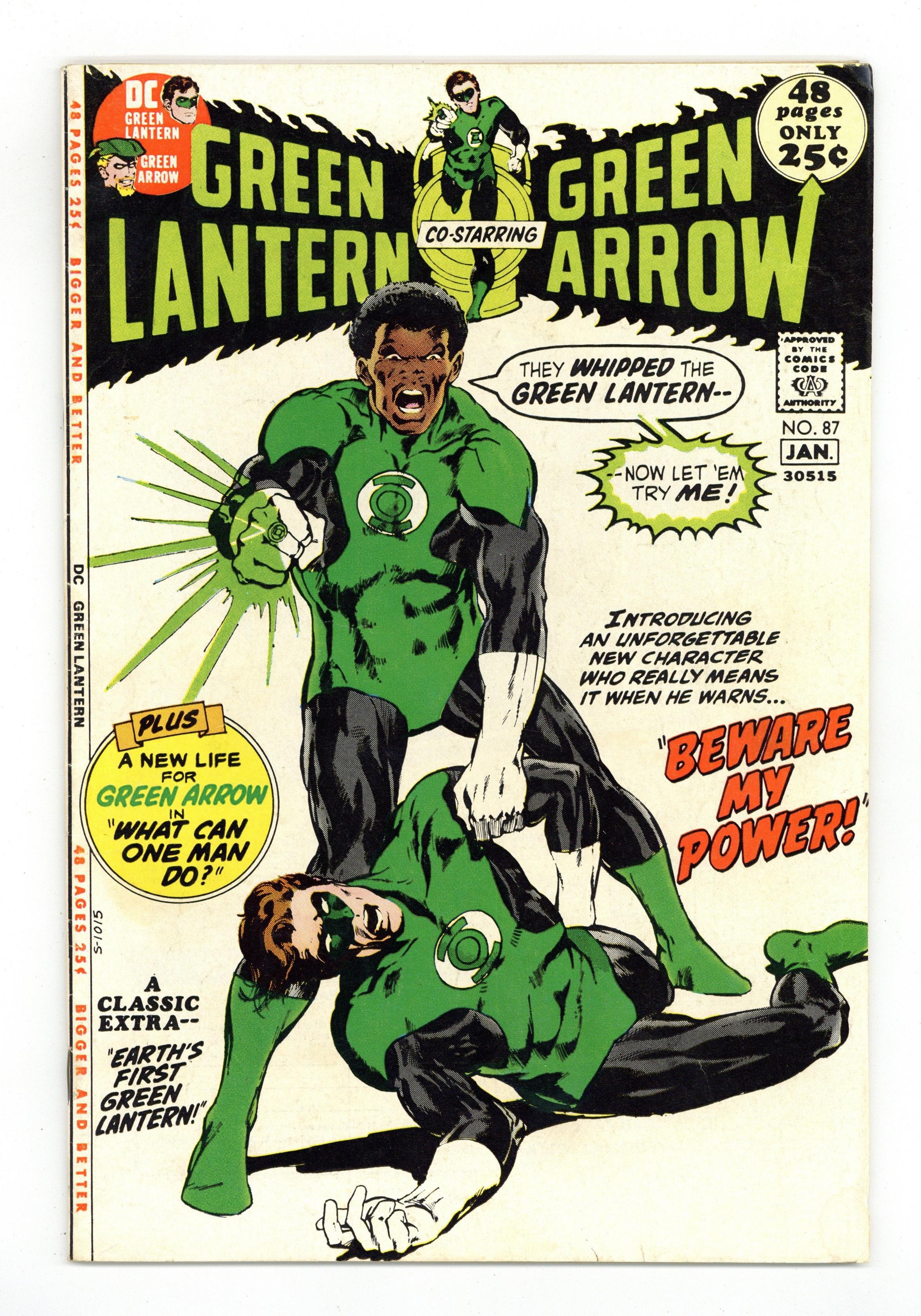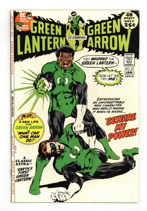 Ended Jul 24 2023 Winning Bid $301 Giant-size issue. Cover by Neal Adams. First appearance of John Stewart in Beware My Power, script by Denny O'Neil, pencils by Neal Adams, inks by Dick Giordano; When Guy Gardner is injured, the Guardians of the Universe instruct Hal Jordan to train another back-up, but John Stewart has different ideas about how to be a Lantern; When an attempt is seemingly made on the life of racist politician Jeremiah Clutcher, John Stewart figures out that the attack was faked and part of a cynical plot to get Clutcher elected president. What Can One Man Do?, script by Elliot Maggin, pencils by Neal Adams, inks by Dick Giordano; After Green Arrow witnesses the death of a young boy in a riot, he decides that he might be able to do more for his city as its mayor. Reprint back-up story: Earth's First Green Lantern!, (from Green Lantern 16), script by Gardner Fox, pencils by Gil Kane, inks by Murphy Anderson; Hal Jordan explains to Pieface why Abin Sur came to Earth in a spaceship when all Green Lanterns can travel thru space unaided. The Flash ad. 52 pgs., full color. $0.25. Cover price $0.25. Grade: VG+ 4.5 explanation of grade Condition: Used (collectible)