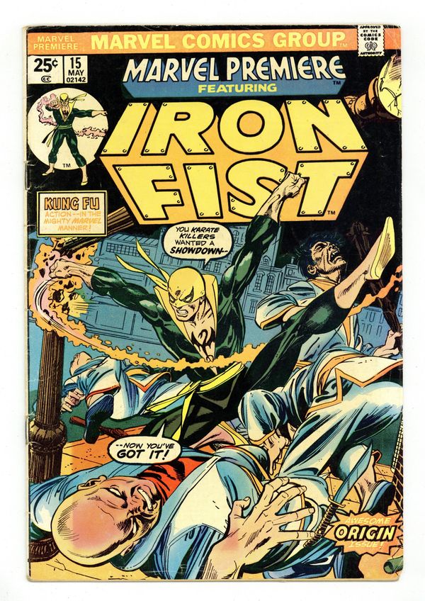 Ended Oct 11 2023 Winning Bid $89 First 25-cent cover price. Origin and first appearance of Iron Fist in The Fury of Iron Fist!, script by Roy Thomas, pencils by Gil Kane, inks by Dick Giordano; Iron Fist passes the final tests in his K'un-Lun training and is granted the privilege of immortality if he so chooses; During his final battle with the robot Shu-Hu, Danny remembers how his father was killed by Meachum and his mother gave her life to save his as the Rand family searched for the fabled city of K'un-Lun. The letters page contains Marvel Value Stamp series A # 94 (Electro by Steve Ditko). Text article explaining price hike to 25 cents for Marvel's 36-page comics, followed by short editorial by Roy Thomas detailing genesis of Iron Fist. 36 pgs. $0.25. Cover price $0.25. Grade: VG- 3.5 explanation of grade Condition: Used (collectible)