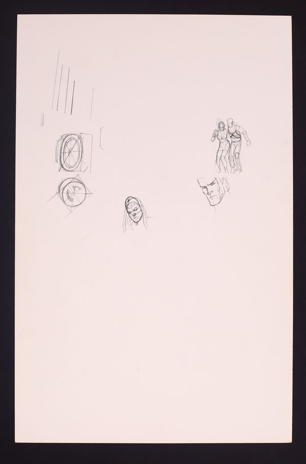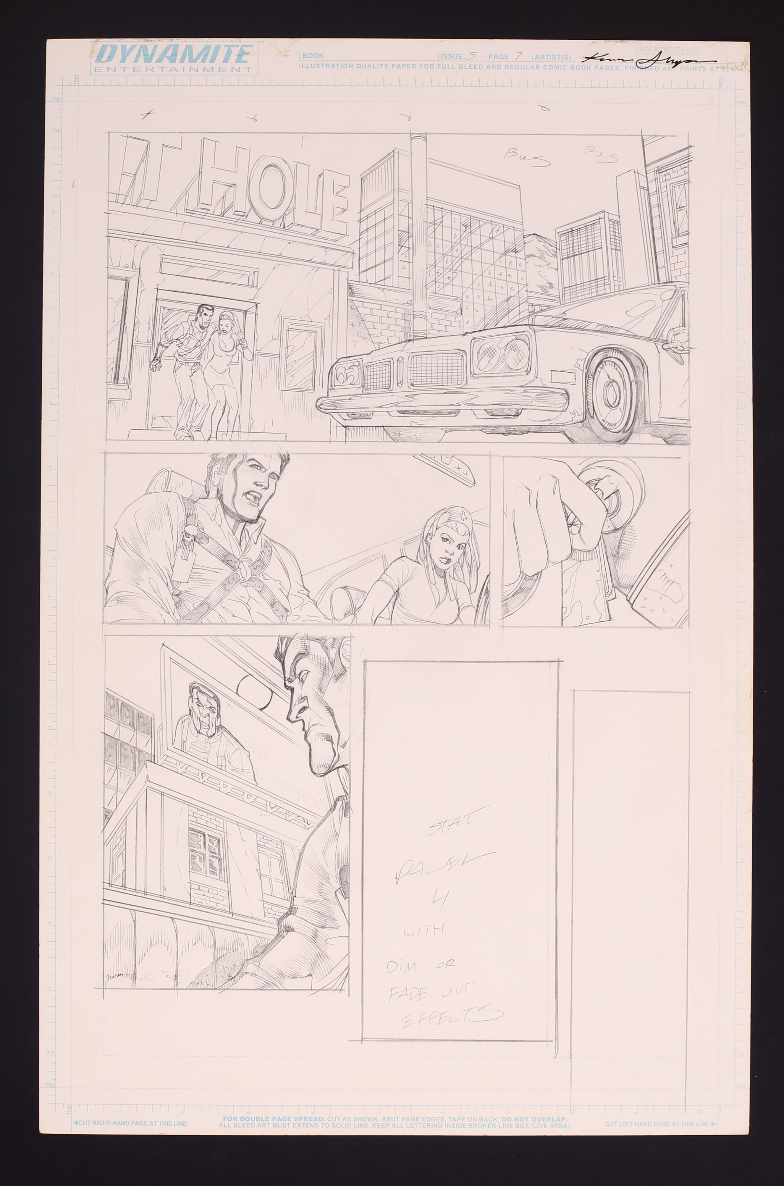 Original Art from Army of Darkness #5 (2006) Page 7 by Kevin Sharpe. Still reeling from the events of Army of Darkness vs. Reanimator, Ash drowns his sorrows at a bar. Good thing he's got some medical assistance to help him get home safely! Signed by the artist in top margin. Pencil on Dynamite Comics art board. 11" x 17", B&W.