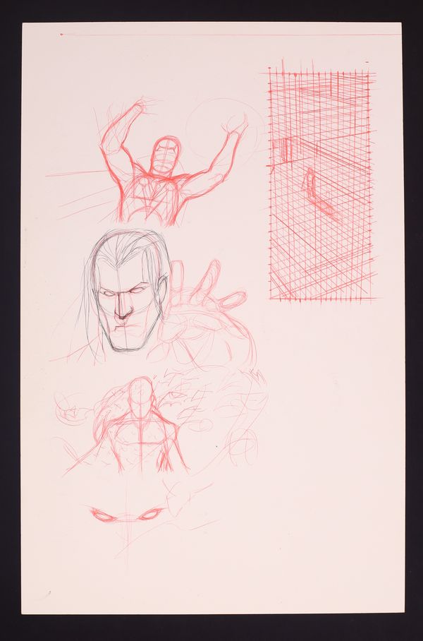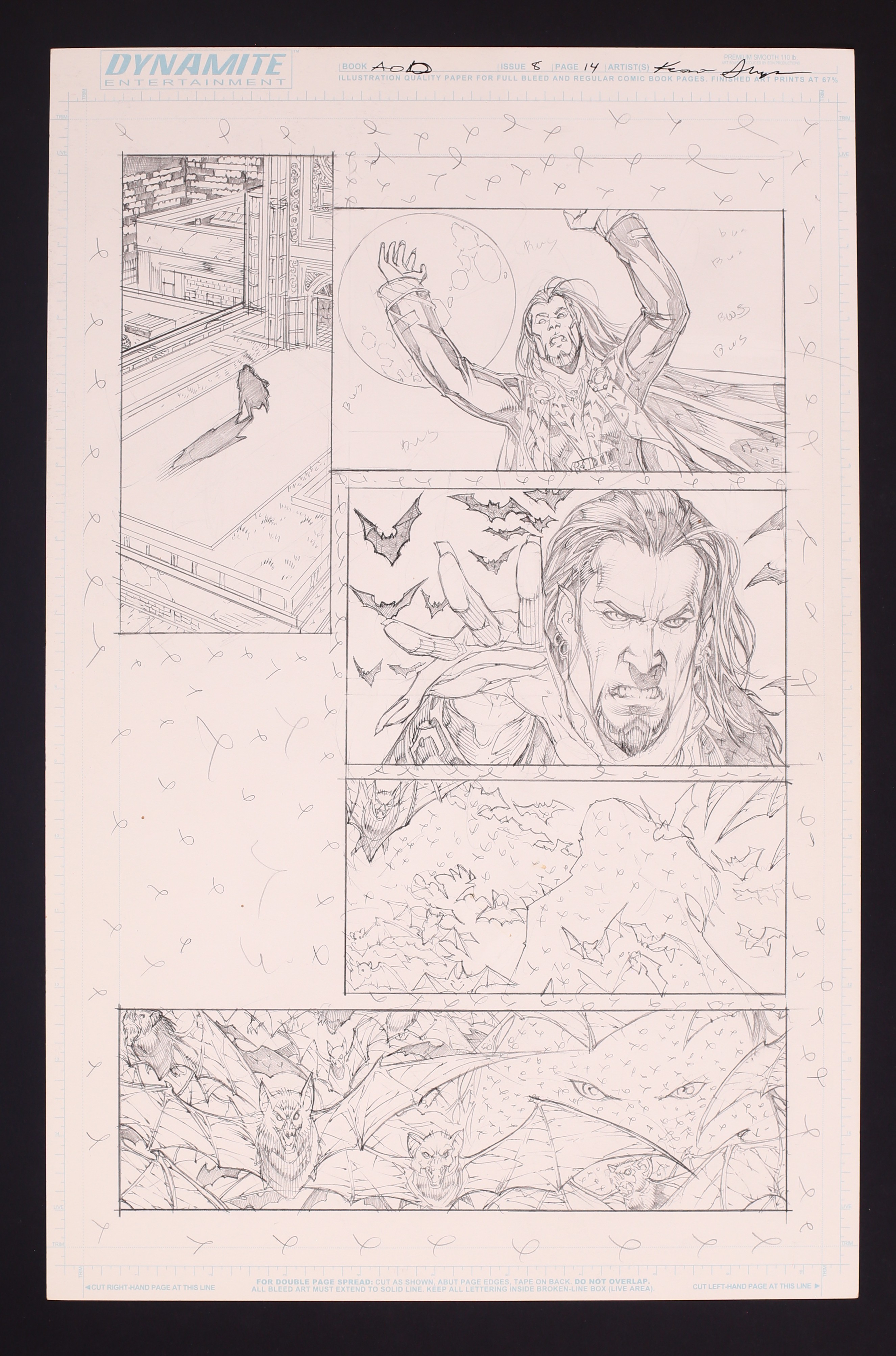 Original Art from Army of Darkness #8 (2006) Page 14 by Kevin Sharpe. An iconic Dracula scene as the Lord of Darkness stands on a roof and calls forth his minions to "Usher in the night!" Signed by the artist in top margin. Pencil on Dynamite Comics art board. 11" x 17", B&W.