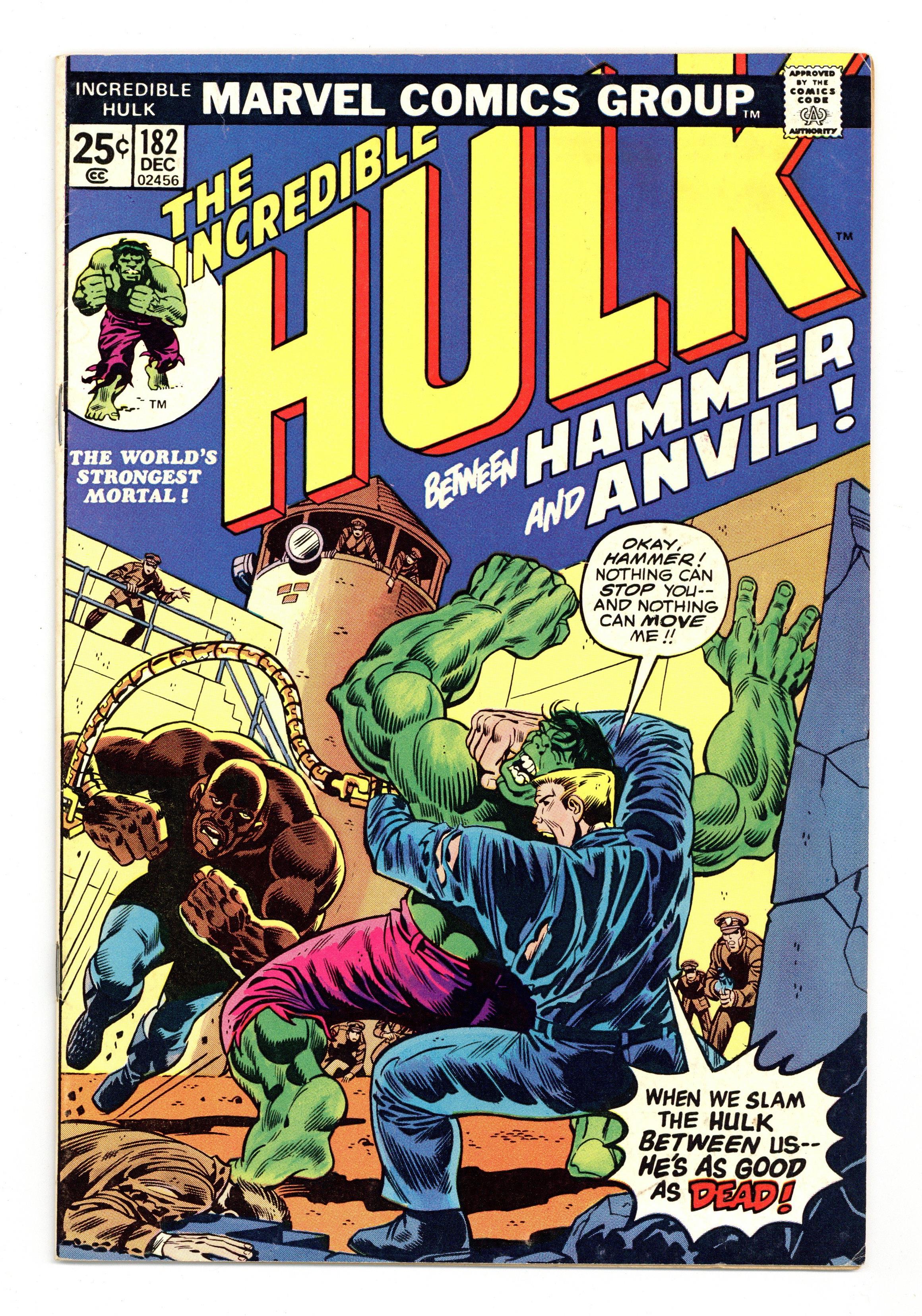 Cover art by Herb Trimpe. First appearance of Hammer and Anvil in "Between Hammer and Anvil!," script by Len Wein, art by Herb Trimpe; The Canadian government reins agent Wolverine back in from his unaccomplished mission of destroying the Hulk; He reluctantly retreats, and they send their special-op commandos to take on the brute; When even that doesnt work, they detonate a huge sleeping gas bomb at him, which finally puts the Hulk out; When the Hulk comes to, he is flying high above the forest, carried by the agents in a steel cage; The Hulk angrily breaks free of his prison, and jumps away to safer pastures. Next Wolverine in Giant-Size X-Men #1. Marvel Value Stamp Series A: The Golem. 36 pages, full color. Cover price $0.25. Grade: FN- 5.5 explanation of grade Condition: Used (collectible)