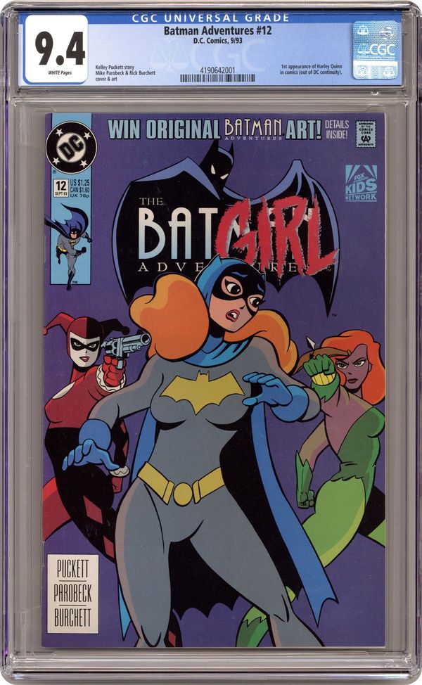 Ended Apr 18 2023 Winning Bid $711 Direct Edition. 1st appearance of Harley Quinn in a comic book. "Batgirl: Day One." Barbara Gordon attends a costume party dressed as Batgirl. Unfortunately, Poison Ivy and Harley Quinn also decide to show up. Based on Batman The Animated Series. Script by Kelley Puckett, pencils by Mike Parobeck, inks by Rick Burchett. Cover by Parobeck. Cover price $1.25. Grade: CGC 9.4 explanation of grade Condition: Used (collectible)