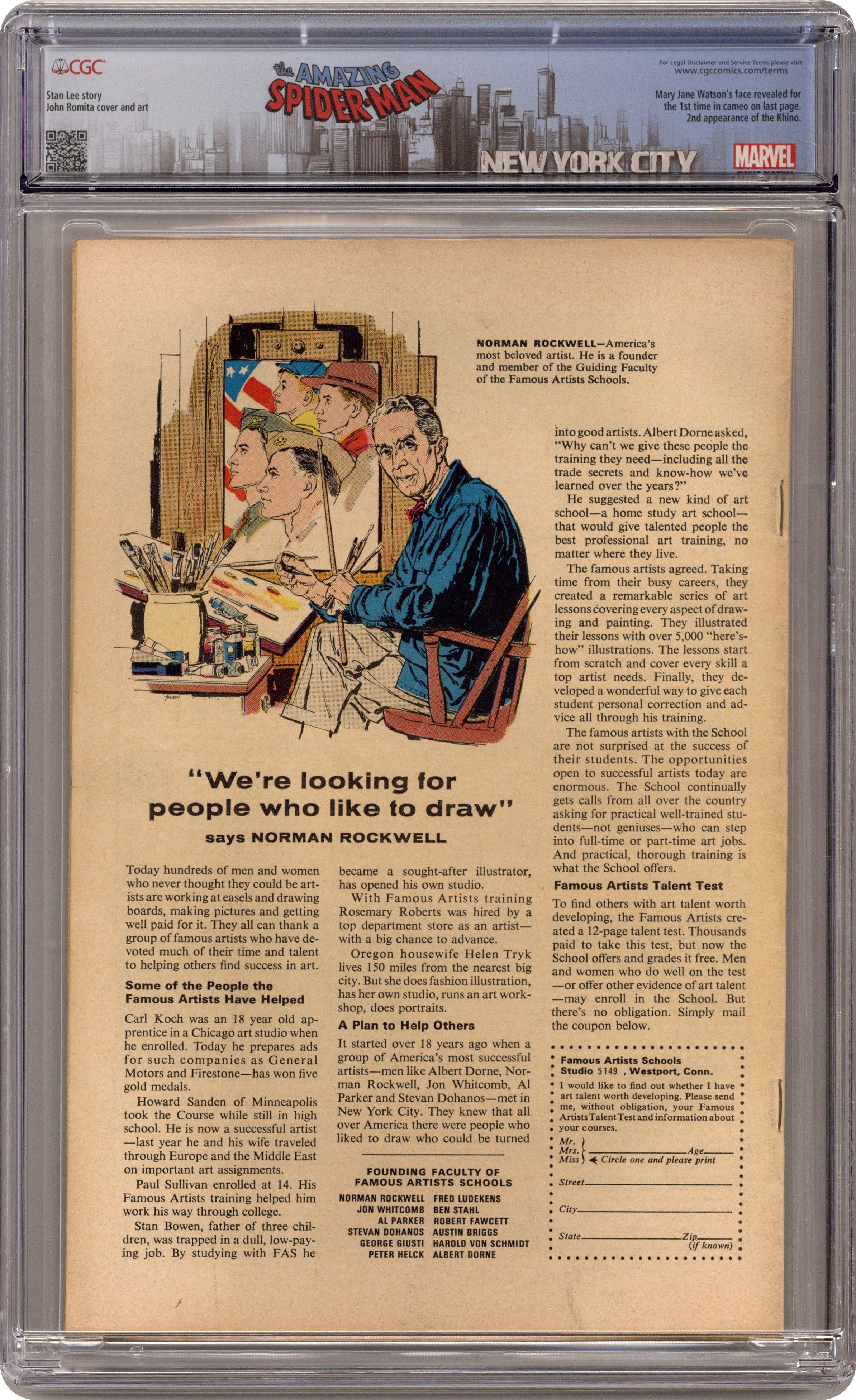 Ended Oct 14 2023 Winning Bid $175 Third appearance of Mary Jane (cameo; first time face is shown). Cover by John Romita Sr. Rhino, Foggy Nelson (from Daredevil), and Dr. Curtis Connors cameos in The Birth of a Super-Hero!, script by Stan Lee, art by John Romita Sr.; John Jameson was exposed to some strange space spores on a space mission. He returns to Earth where he gains super strength; Spider-Man is mistakenly accused of robbing a bank so Jameson decides to try to capture him with his new super powers. Ad for the M.M.M.S. fan club. Reprinted in Marvel Tales # 31 and 182. 36 pgs., full color. $0.12. Cover price $0.12. Grade: CGC 6.0 explanation of grade Condition: Used (collectible)