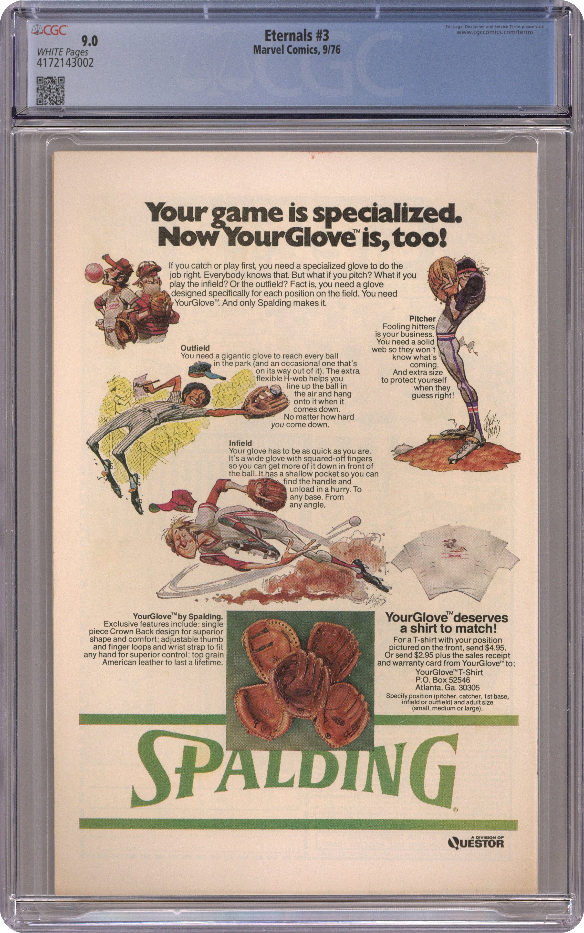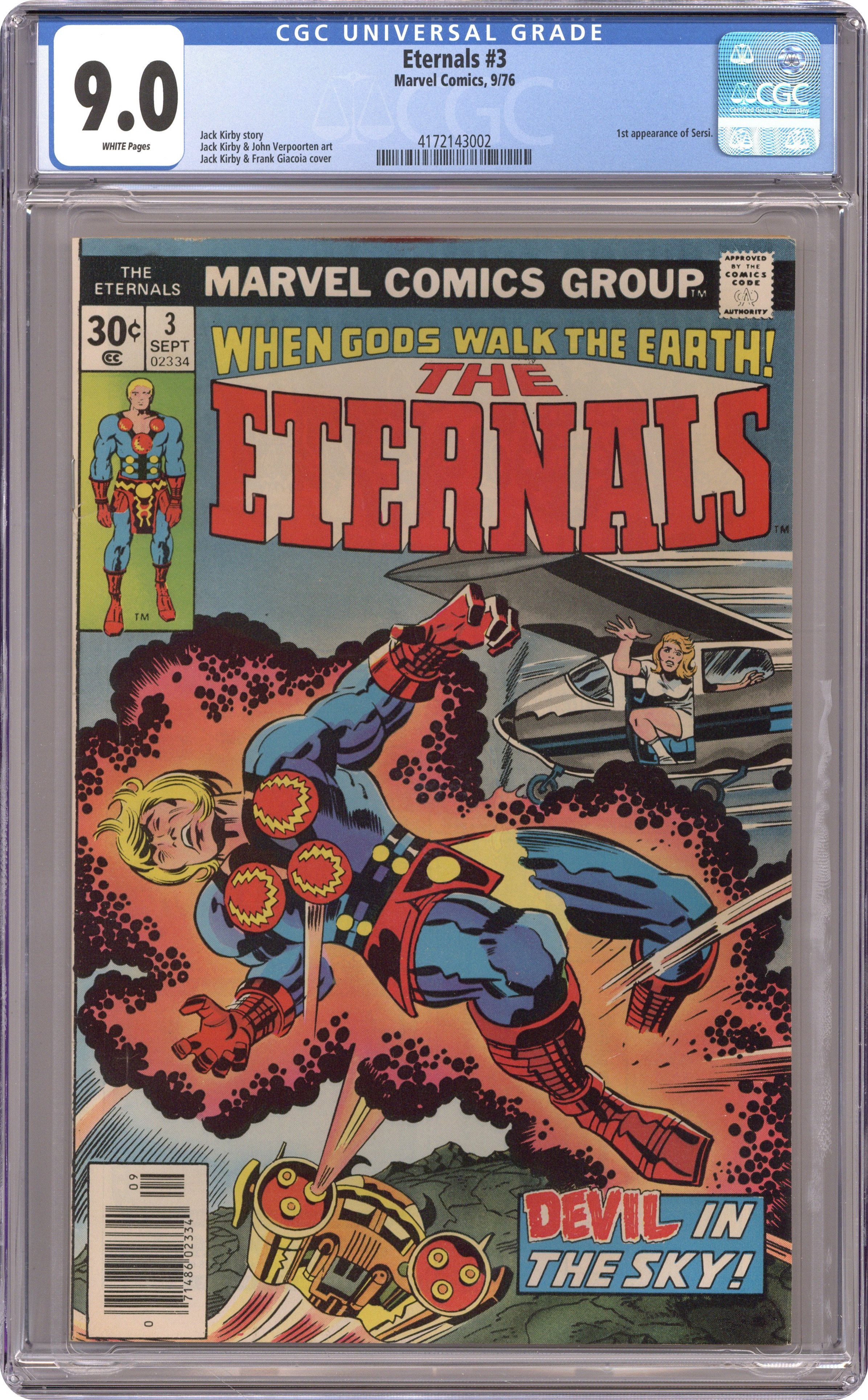 Ended Oct 23 2023 Winning Bid $39 "The Devil in New York!" Written by Jack Kirby. Pencils by Jack Kirby. Inks by John Verpoorten. The hidden chapters in the history of man are quickly being revealed. The Celestials have returned! Untouched for thousand years, a large crypt in an Incan ruin has discharged a living flight crew. As Margo's head spins from all the fantastic sights she has seen, sights no mortal before has seen, Ikaris introduces her to the fabulous Eternal beauty known as Sersi. Meanwhile, if the gods haves returned, can the monsters be far behind. The beastly Deviants, the sworn enemy of the Eternals and mankind, prepare to attack! Notes: 1st appearance of Sersi. Letter to the editor from comics writer Ralph Macchio. Cover price $0.30. Grade: CGC 9.0 explanation of grade Condition: Used (collectible)