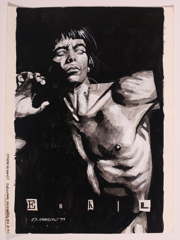 Original Art from Queen of the Damned #10 (1993) Enkil Pin-Up (Inside Front Cover) by OJ Cariello. An Egyptian king and the husband of Akasha, Enkil was the second vampire brought into existence and he's beautifully rendered here by Cariello. Signed by the artist. Paint on heavy stock with pasted-in lettering. 13" x 17 1/2", B&W.