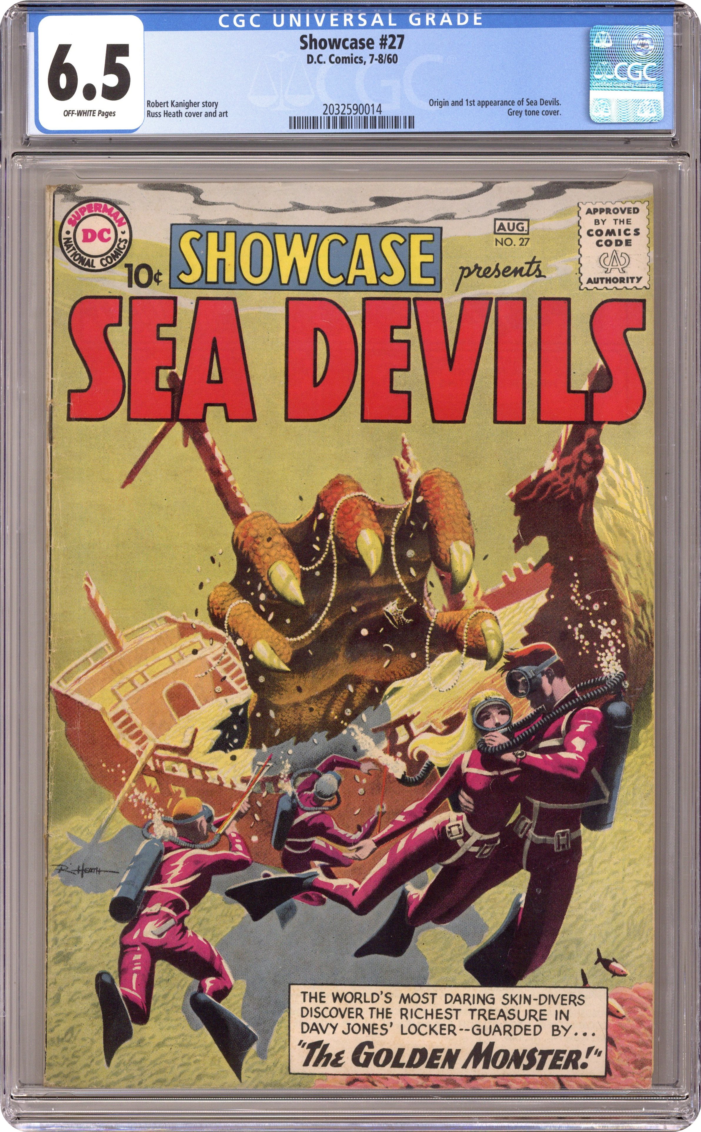 Ended Oct 13 2023 Winning Bid $210 Cover art by Russ Heath. 1st appearance of Sea Devils in The Golden Monster!, script by Robert Kanigher, art by Russ Heath; SCUBA diver Dane Dorrance hopes to earn his Dad's UDT flippers; Judy Walton hopes to land the lead in the movie "Sea Devils"; Biff Bailey hopes to prove he's not a "clumsy ox"; Nicky Walton hopes to prove he's a man. The A-B-Seas of Skin Diving!, script by Robert Kanigher, pencils by Ross Andru, inks by Mike Esposito; Information on scuba diving, equipment, mysteries and joys; And "Never dive alone!" Monsters of the Seven Seas! article. Ad for The Many Loves of Dobie Gillis, art by Bob Oksner. 36 Pages, Full Color. Cover price $0.10. Grade: CGC 6.5 explanation of grade Condition: Used (collectible)