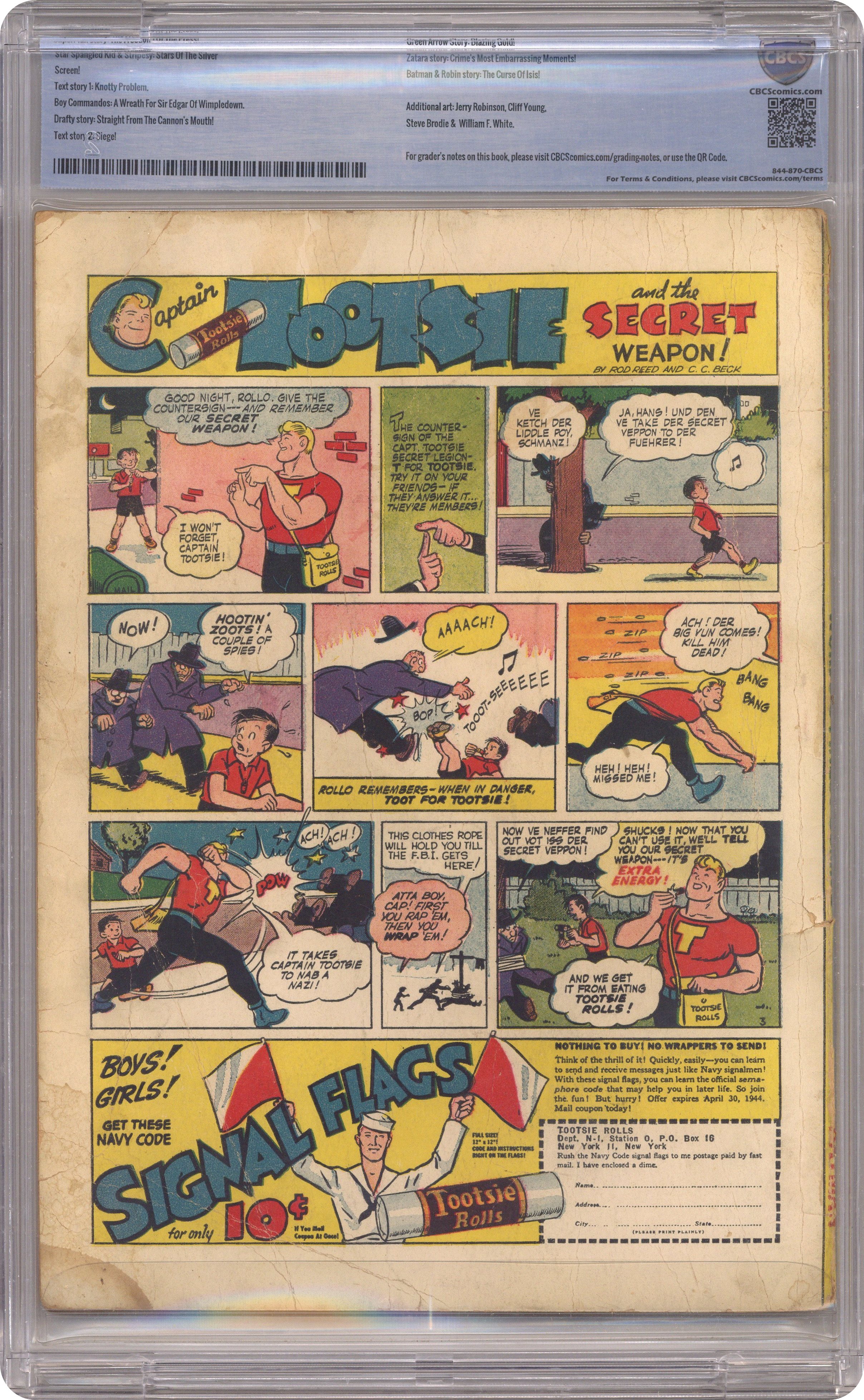 Ended Oct 13 2023 Winning Bid $184 Cover art by Jack Burnley. The Freedom of the Press! starring Superman, script by Don Cameron [as Jerry Siegel], pencils by Ira Yarbrough [as Joe Shuster], inks by George Roussos [as Joe Shuster]; Lois and Clark are given the assignment to write a special story concerning the staff of the Daily Planet, but gangsters try to stop the Planet from publishing that 100th Anniversary issue. Stars of the Silver Screen starring The Star Spangled Kid and Stripesy, art by Hal Sherman. A Wreath For Sir Edgar of Wimpledown starring The Boy Commandos, script and pencils by Joe Simon, inks by Jack Kirby. Straight From The Cannon's Mouth starring Drafty, art by Stan Kaye. Paper Salvage public service announcement starring Batman and Robin, art by Jerry Robinson. Blazing Gold starring The Green Arrow, pencils by Cliff Young, inks by Steve Brodie; Crime's Most Embarrassing Moments starring Zatara, art by William F. White. The Curse of Isis! starring Batman and Robin, script by Bill Finger, pencils by Jack Burnley [as Bob Kane], inks by George Roussos [as Bob Kane] and Ray Burnley (backgrounds); A mysterious swami uses the threat of a false curse to try and obtain some rabbit's foot lucky charms from some sailors that he had secretly planted a fortune in diamonds in. 84 pages, Full Color. Cover price $0.15. Grade: CBCS 2.0 explanation of grade Condition: Used (collectible)