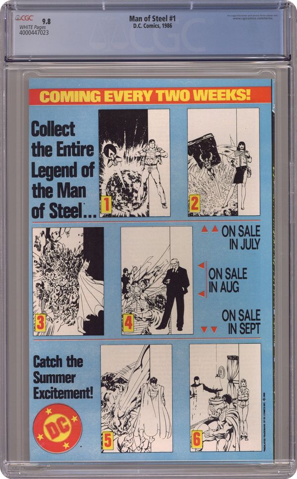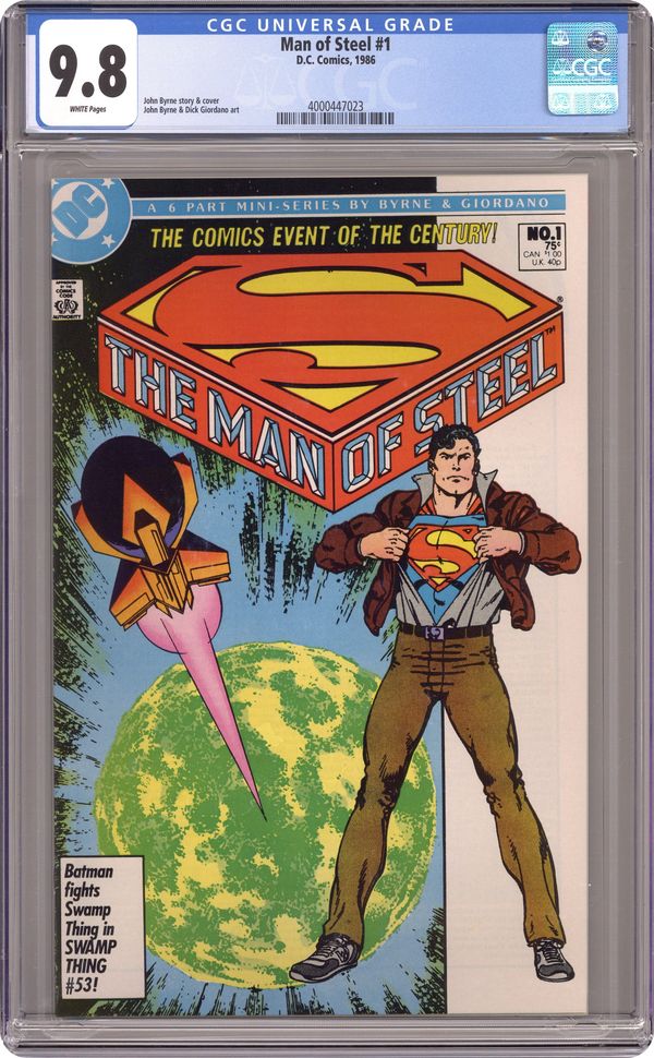 Standard Direct Edition. Published just a few months after Crisis on Infinite Earths, John Byrne's The Man of Steel updated the saga of Superman for modern audiences. His origin was altered, as were many other aspects of the character. This first issue reveals that Kal-El was conceived via the mingling of seeds in a matrix chamber, Clark's powers developed slowly over time (meaning Superboy was written out of continuity), and Superman's body projected an aura that protected his now vulnerable costume. Written and drawn by John Byrne, with inks by Dick Giordano. Cover price $0.75. Grade: CGC 9.8 explanation of grade Condition: Used (collectible)
