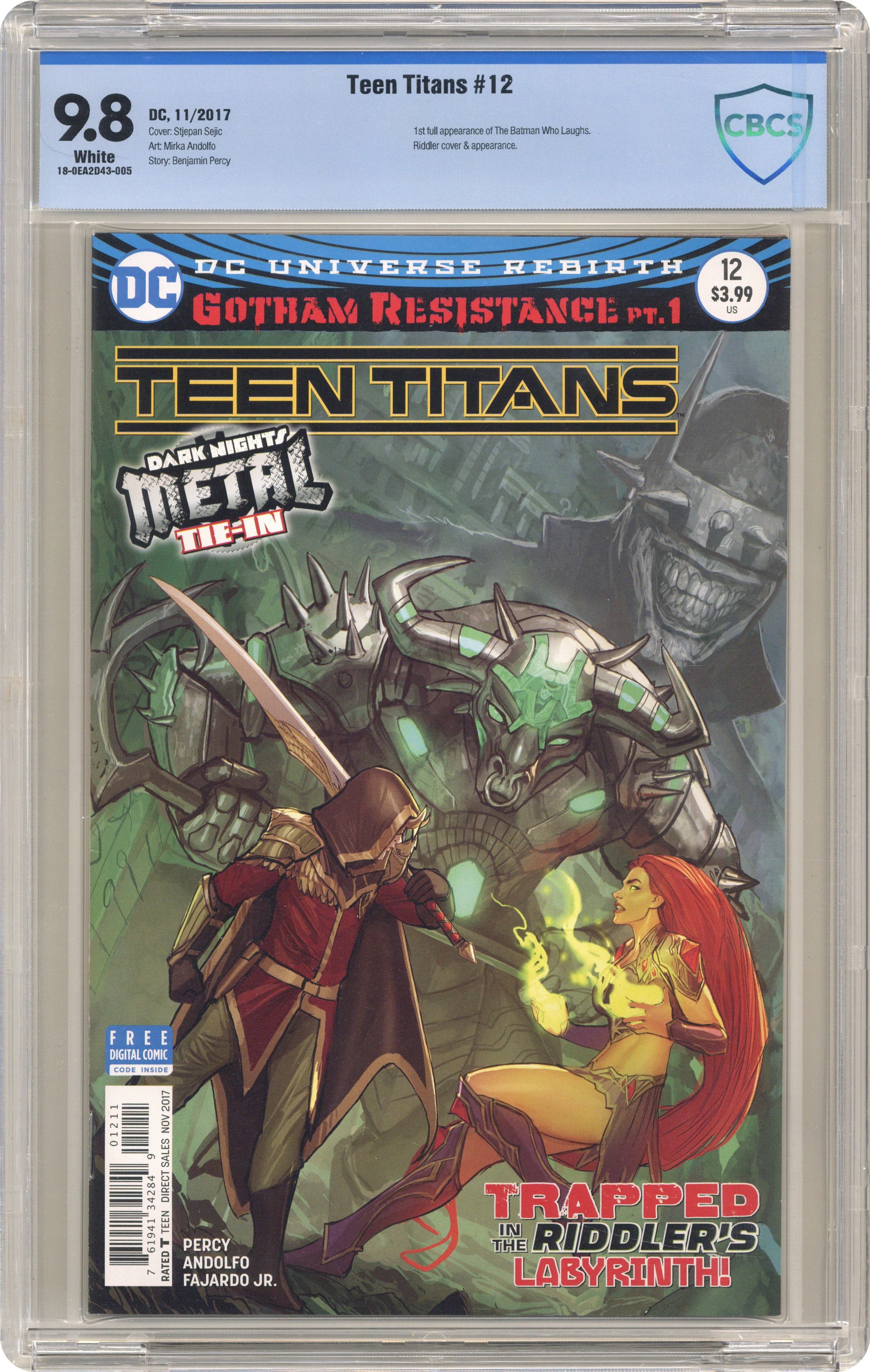 Ended Dec 22 2023 Winning Bid $325 Written by Ben Percy. Art by Mirka Andolfo. Cover by Stjepan Sejic. A DARK NIGHTS: METAL tie-in! 'GOTHAM RESISTANCE' part one! The fight for Gotham City's soul starts here! When Robin receives a distress call from Nightwing urging him to return home, he discovers that Gotham City has been transformed into a mosaic of monsters, magic and doom! Trapped inside the Riddler's deadly maze with nowhere to turn, Robin soon assembles an unlikely team of hometown heroes including Batgirl, Harley Quinn, Killer Croc, Black Canary and Green Arrow to find the missing Nightwing and save their city! 32 pages, full color. Rated T Cover price $3.99. Grade: CBCS 9.8 explanation of grade Condition: Used (collectible)
