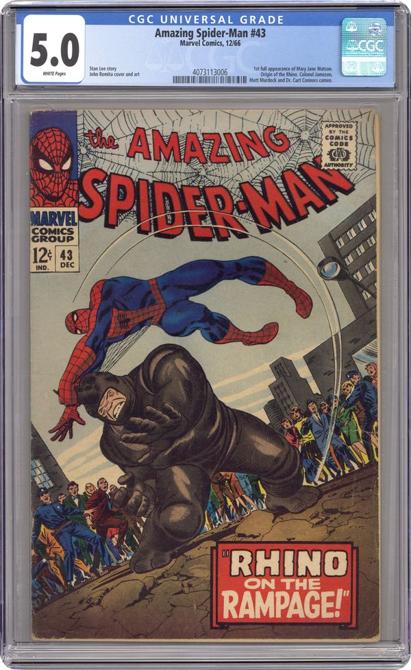 Ended Jul 12 2023 Winning Bid $265 1st full appearance of Mary Jane (cameos in #25,38, & 42). Cover by John Romita Sr.. MJ has her first in-depth interaction with Peter Parker, plus cameos by Foggy Nelson and Matt Murdock (Daredevil) in Rhino on the Rampage!, script by Stan Lee, art by John Romita Sr.; Rhino escapes from police custody and is looking for revenge on Spider-Man for defeating his attempt to kidnap John Jameson. Reprinted in Marvel Tales # 32 and 183. 36 pgs., full color. $0.12. Cover price $0.12. Grade: CGC 5.0 explanation of grade Condition: Used (collectible)
