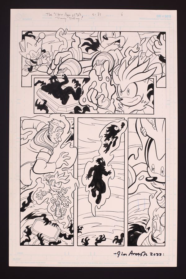 200 years in the future, Silver the Hedgehog and his ally Professor Von Schlemmer have been thrown into a reality-breaking Genesis Portal! Of course they are our heroes, so on this page we see their last minute escape! Signed by Amash in bottom margin. Pencil and ink on comic art board. 11" x 17", B&W.