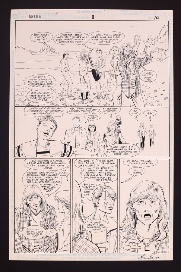 A well drawn teen scene of Anima's (aka Courtney Mason) friends arriving in a magical realm and trying to find their bearings- as well as dealing with a healthy dose of drama! Signed by Pepoy in bottom margin. Pencil and ink on DC Comics art board. 11" x 17", B&W.