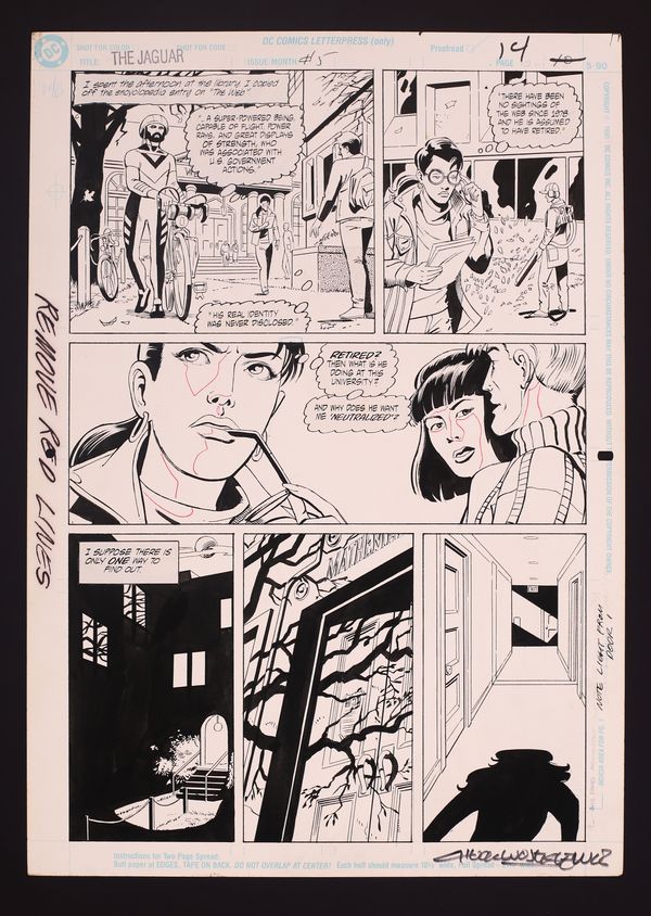 An interesting time in comic book history- Archie had licensed its superhero characters to DC who placed them in their own universe and attempted to sell the titles exclusively outside of the direct market in order to reach an audience that didn't know about comic shops! The experiment didn't last long, but it did result in some pretty good reimaginings of characters like The Jaguar, seen here doing some detective work on her college campus! Signed by Wojtkiewicz in bottom margin. Pencil and ink on DC Comics art board. 11 1/2" x 16 1/2", B&W.