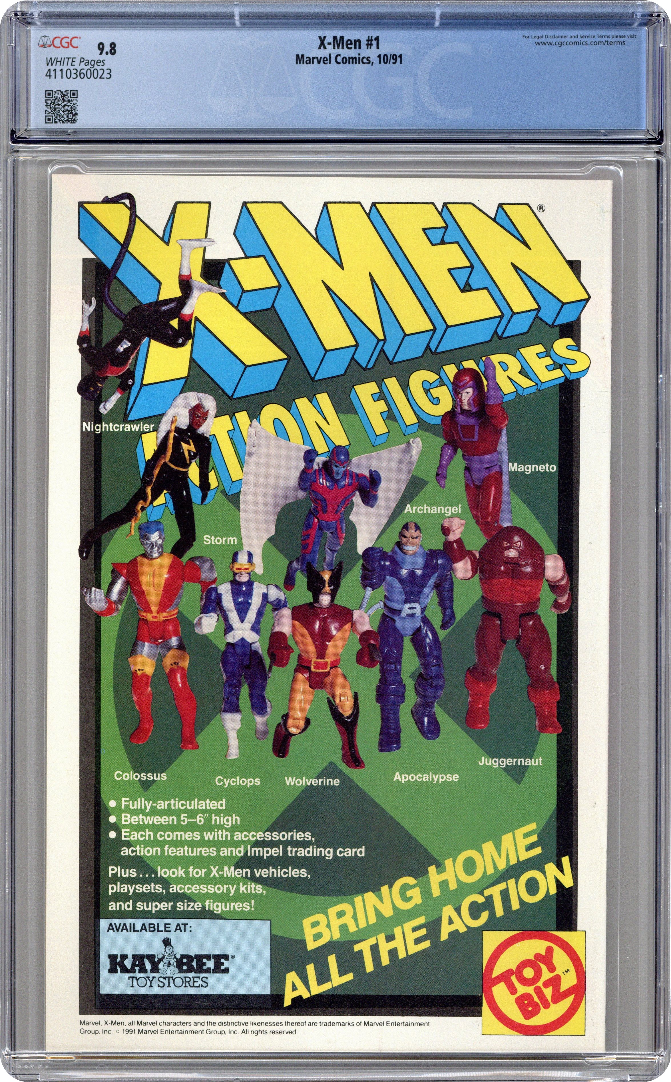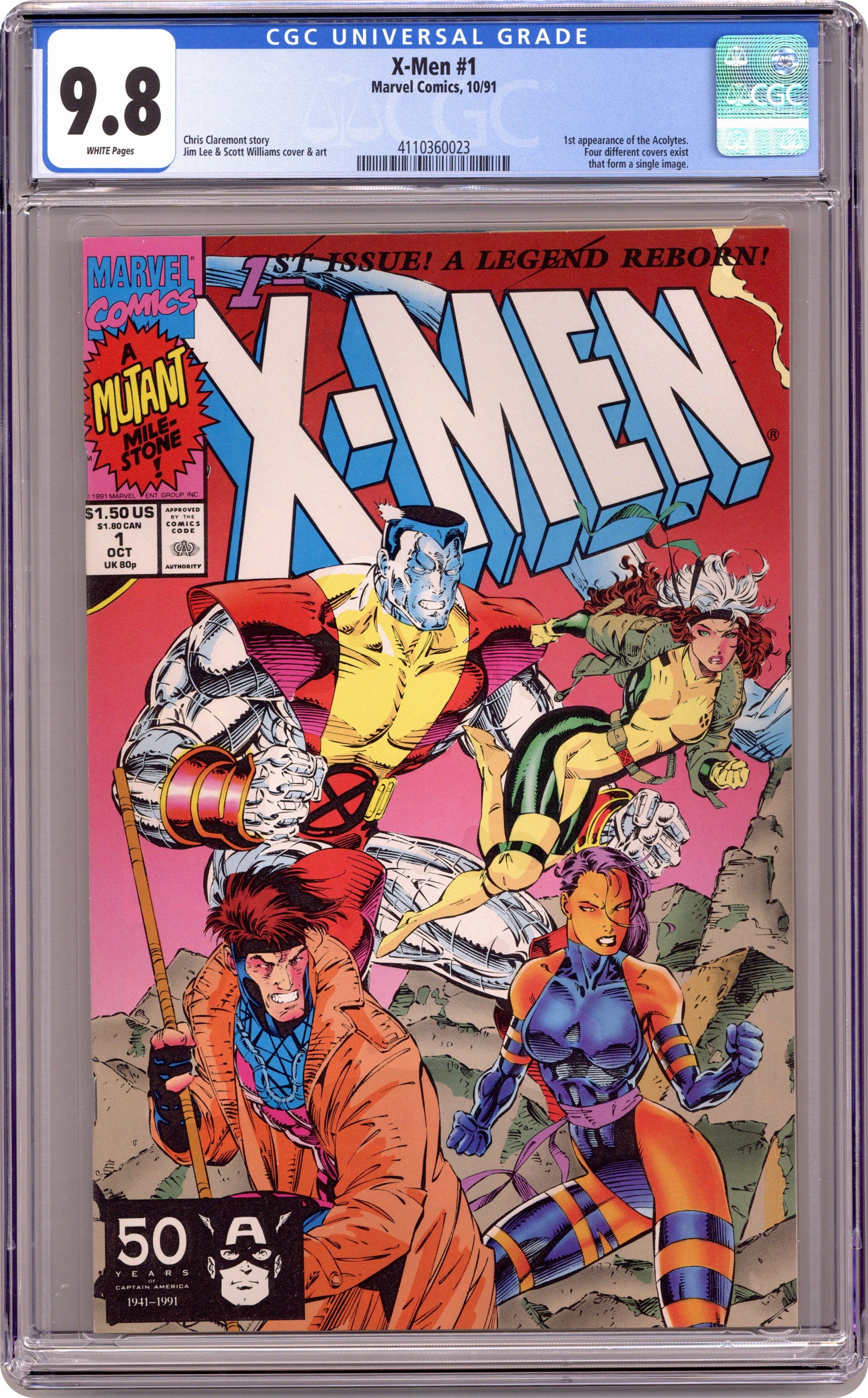 Direct Edition. Colossus/Gambit/Psylocke/Rogue cover. Cover pencils by Jim Lee (signed), inks by Scott Williams. Rubicon, script by Jim Lee (Co-Plot) and Chris Claremont, pencils by Jim Lee, inks by Scott Williams; Magneto forms the Acolytes and proclaims Asteroid M a haven for mutants everywhere; But the rest of the world doesn't see it that way; Nick Fury cameo. 2-page pin-up: gallery of X-Men villains. X-Men Sketchbook by Jim Lee. Cover price $1.50. NOTE: Cover B connects to covers 1A, 1C, and 1D to form a single giant image. Cover price $1.50. Grade: CGC 9.8 explanation of grade Condition: Used (collectible)