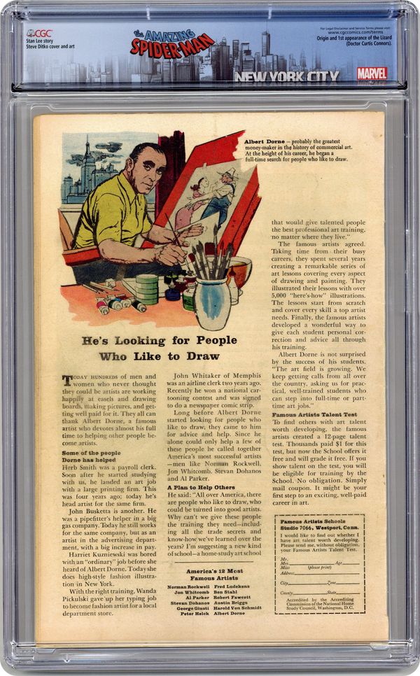 Ended Apr 11 2023 Winning Bid $800 Cover art by Steve Ditko. First appearance of the Lizard in Face-to-Face With...the Lizard!, script by Stan Lee, art by Steve Ditko; The Bugle challenges Spider-Man to put an end to the Lizard's rampage. Vulture cameo. Reprinted in Marvel Tales # 3 and 143. 36 pgs. $0.12. Cover price $0.12. Grade: CGC 4.0 explanation of grade Condition: Used (collectible)