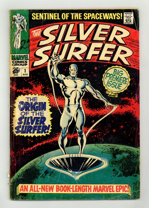 "The Origin of the Silver Surfer!" Cameos by the Incredible Hulk, Doctor Doom, and the Fantastic Four. Written by Stan Lee. Art and cover by John Buscema and Joe Sinnott. Many years ago, in order to prevent the total annihilation of his civilization and homeworld, Norrin Radd bargained with the Devourer of Worlds. Imbued with the Power Cosmic, he became the Silver Surfer and Herald of Galactus. However, on the fateful day he arrived on Earth, for love of humanity, he betrayed his master, and thus was cursed to never traverse the space-ways again. This is his story. Includes the Watcher back-up "The Wonder of the Watcher!" Story by Stan Lee. Art by Gene Colan and Syd Shores. 68-page giant. Cover price $0.25. Grade: FR 1.0 explanation of grade Condition: Used (collectible)