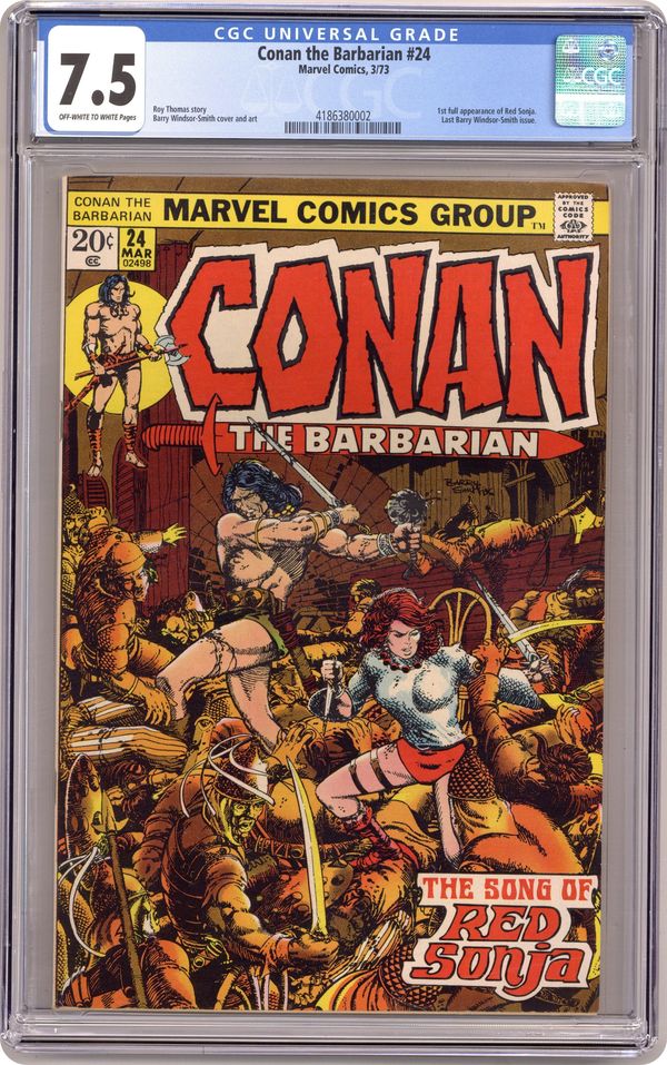 Ended Jul 14 2023 Winning Bid $150 Cover art by Barry Windsor-Smith. First full Red Sonja story, The Song of Red Sonja, script by Roy Thomas, pencils by Barry Windsor-Smith; setting: Makkalet; Conan and Red Sonja start a bar-fight, bathe in a fountain, scale temple walls, break in and steal a snake-tiara, and fight a magical snake; at the end Sonja tricks Conan, and leaves for Pah-Disha; the Red Sonja story continues in Savage Sword of Conan 1. Final Windsor-Smith art on this title. The art in this issue (at least on page 8, and perhaps elsewhere) was altered without Windsor-Smith's approval. See Marvel Treasury Edition 15 or Savage Sword of Conan 82 for the original version. (The reprint in Conan Saga 8 contains the altered version). In the letter's column, Roy Thomas responds and announces Barry Smith's final departure as Conan the Barbarian artist; Incidentally, Roy's responses to R. Benitz and Keith Taylor are mistakenly transposed. 36 pgs. Cover price $0.20. Cover price $0.20. Grade: CGC 7.5 explanation of grade Condition: Used (collectible)