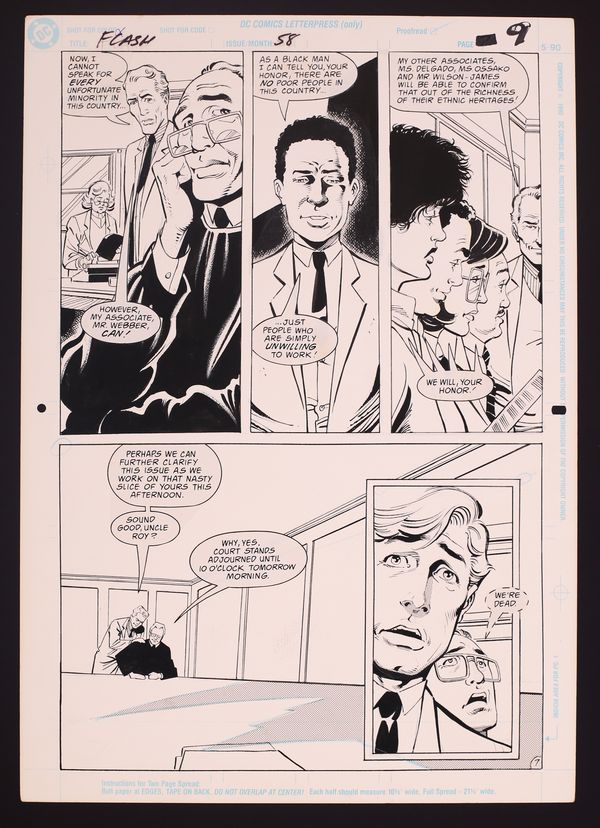 A red-suited superhero who, in his civilian life, spends his days in a courtroom- that's right, it's Wally West aka The Flash! A well-illustrated courtroom scene page that sees Wally realizing his case might not be as much of a slam dunk as he expected! Pencil, ink, and screentone on DC Comics art board. 11 1/2" x 16 1/2", B&W.