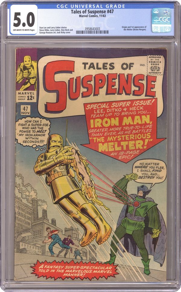 Ended Apr 14 2023 Winning Bid $245 Cover pencils by Jack Kirby, inks by George Roussos. "Iron Man Battles the Melter!", script by Stan Lee, pencils by Steve Ditko, inks by Don Heck; A former competitor of Tony Stark becomes the Melter and sabotages one of his plants. Iron Man tries to defend it but must flee before the Melter; He defeats him by constructing an aluminum suit that he cannot melt. "The Green Man" text story. "Shock!", script by Stan Lee (plot) and Larry Lieber (script), pencils by Larry Lieber, inks by George Roussos (as G. Bell); A radar operator turns off Earth's defenses when alien raiders offer him the most beautiful woman in the universe. 36 pages, full color. Cover price $0.12. Grade: CGC 5.0 explanation of grade Condition: Used (collectible)