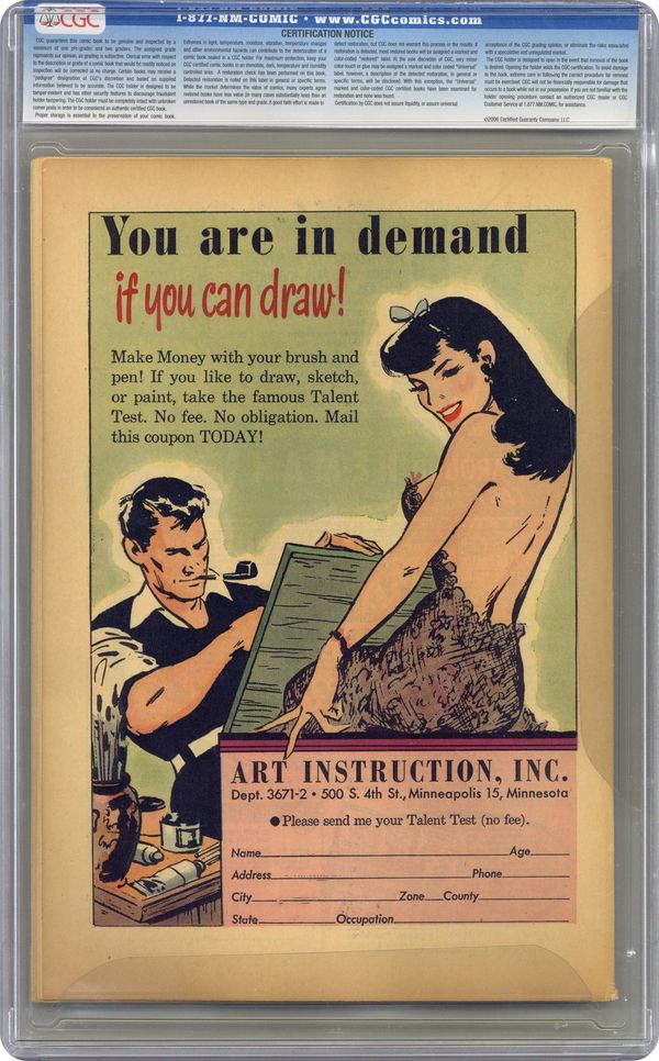 Ended Apr 20 2023 Winning Bid $312 "The Howling Head," "The Hands of Horror," "The Vampire's Bane," "True Ghosts of History: The Highland Phantom," "The Ghoul's Grave," "Case of the Spectral Schoolboy," and "The Frozen Specter." Edited by Richard E. Hughes. Cover by Ogden Whitney. Stories by Lin Streeter, George Klein, Richard Brice, Frank Siminski, Art Gates, W. G. Hargis, John Rosenberger, and Al Camy. Spine-chilling tales of suspense, horror, and the supernatural—prepare yourself for Adventures into the Unknown! 52 pages, full color. $0.10. Cover price $0.10. Grade: CGC 8.0 explanation of grade Condition: Used (collectible)