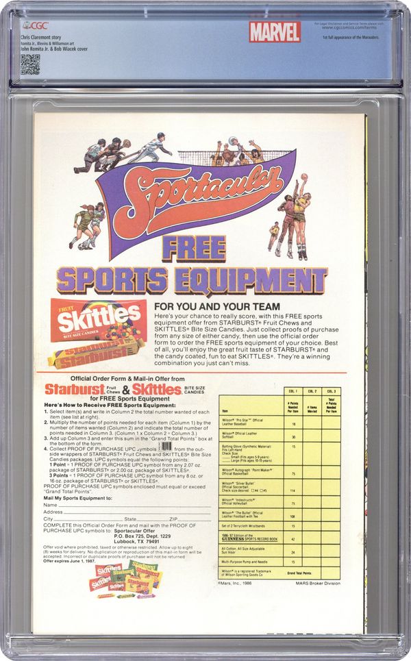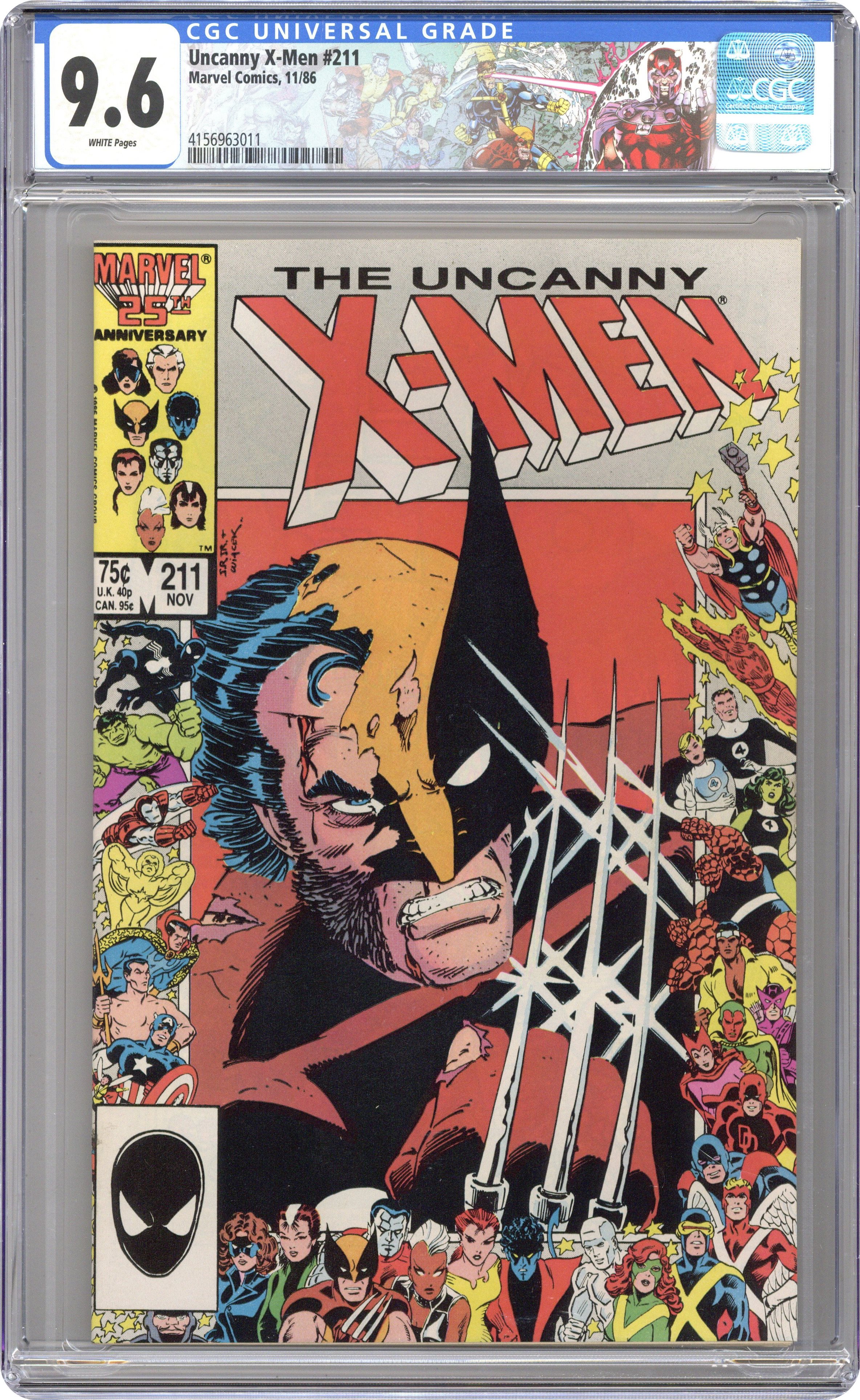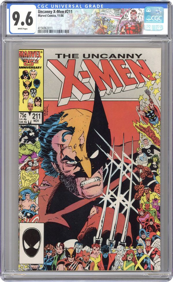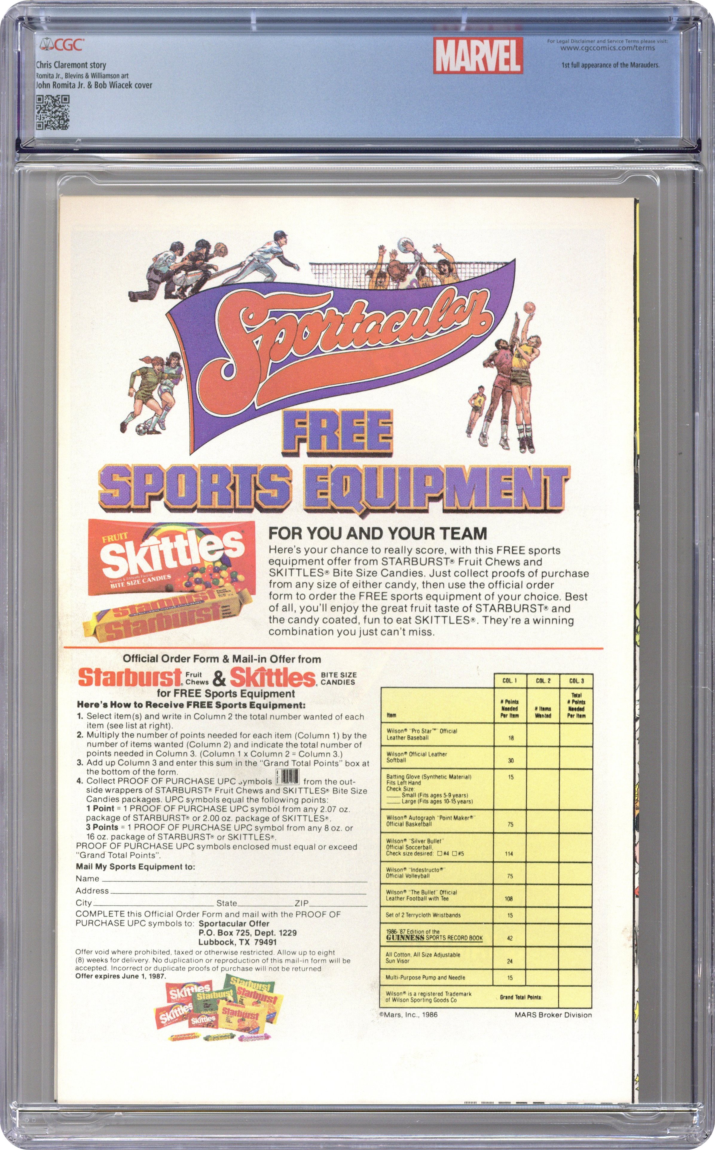Direct Edition. Marvel 25th Anniversary Cover - Mutant Massacre tie-in - "Massacre!" Story by Chris Claremont. Art by John Romita, Jr., Bret Blevins, and Al Williamson This issue continues one of the darkest chapters in mutant history. A mercenary force called the Marauders attempts to commit genocide on the outcast Morlocks, and the only thing standing in their way is the X-Men and X-Factor. This is a storyline that has repercussions on the X-titles for years to come. When the X-Men finally catch up to the murderous villains one of the costliest battles in X-Men history follows. It's a battle that will leave several members of the team severely injured. Story continues in New Mutants #46 and Power Pack #27. NOTE: Includes the Mutant Massacre Map, a key to following the events in this pivotal storyline. 36 pgs. Cover price $0.75. Grade: CGC 9.6 explanation of grade Condition: Used (collectible)