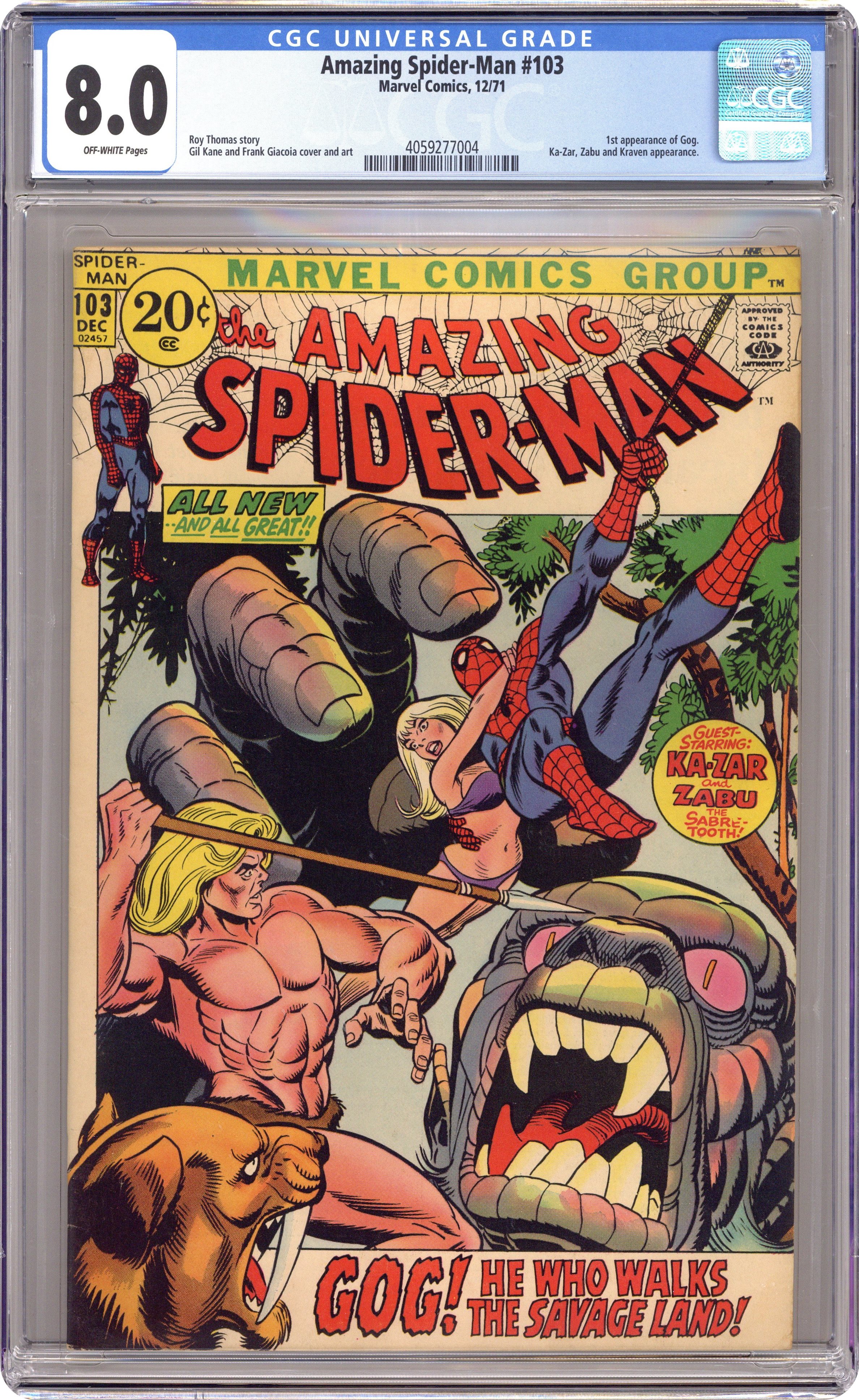 Ended Apr 4 2023 Winning Bid $56 "Walk the Savage Land!" Part 1 of 2. Guest-starring Ka-Zar. Script by Roy Thomas. Pencils by Gil Kane. Inks by Frank Giacoia. Cover by Gil Kane and Frank Giacoia. Spider-Man and Gwen Stacy in the Savage Land with Ka-Zar!What a cover preview! But how did they get there? The story begins a few days earlier when J. Jonah Jameson -- upset about the Daily Bugle's declining circulation numbers -- hears a tale about a mysterious monster in the Savage Land. Jonah immediately orders an in-depth feature on Ka-Zar'shidden jungle to boost the Bugle's sales! And he will lead the expedition to Antarctica himself! However the Savage Land is fraught with danger. Shortly after the group arrives, the gigantic monster called Gog grabs Gwen!And the web-slinger will move heaven and earth...and anything else in the Savage Land...to get her back! Cameo appearances by Joe Robertson, Zabu, and Kraven the Hunter. First 20ยข cover price. (Notes: Ka-Zar and the web-slinger first met in Amazing Spider-Man #57. This issue was reprinted in Marvel Tales #81 and #82.) 36 pages. Cover price $0.20. Grade: CGC 8.0 explanation of grade Condition: Used (collectible)