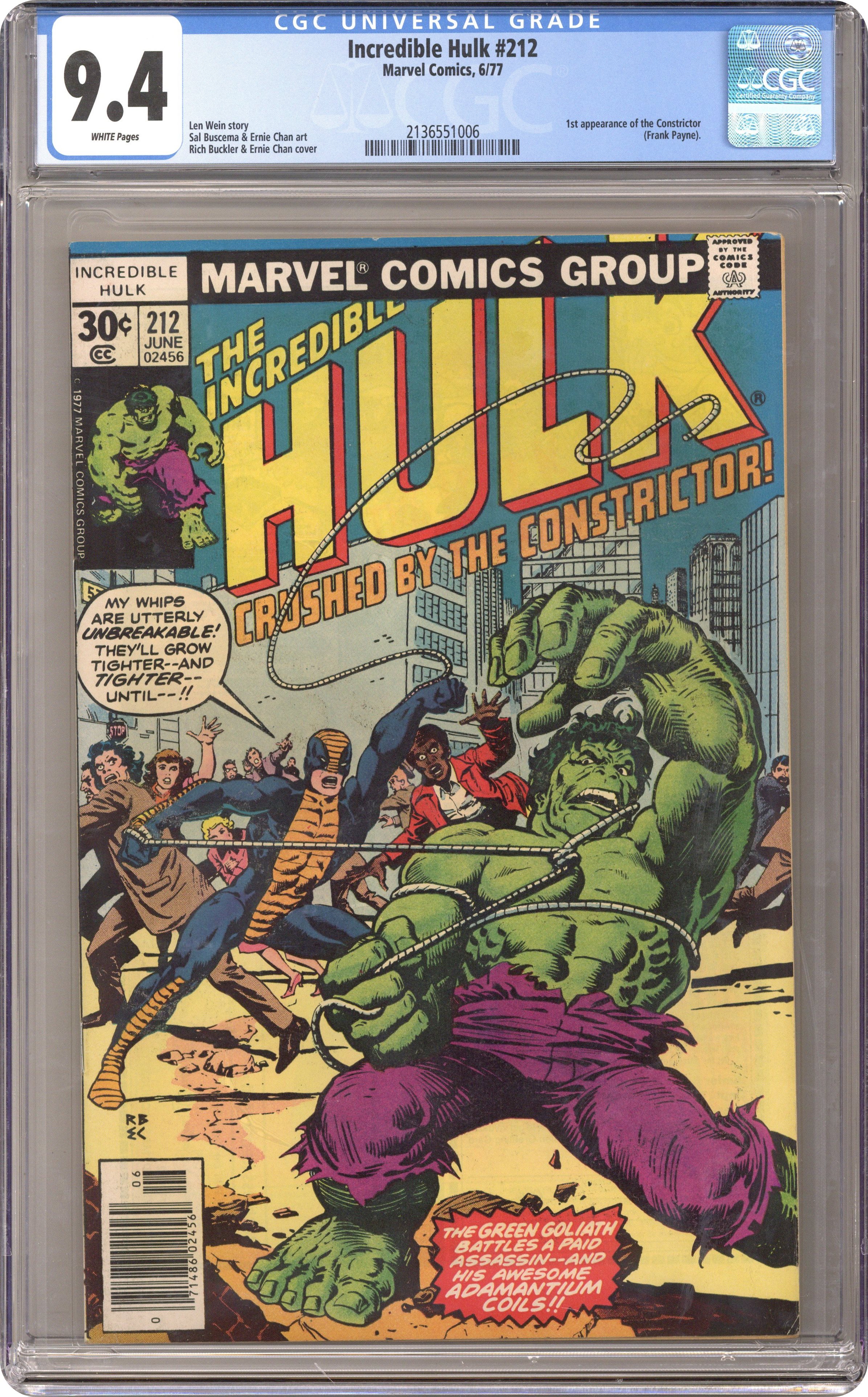 Ended Sep 11 2023 Winning Bid $54 Cover pencils by Rich Buckler, inks by Ernie Chan. "Crushed By...the Constrictor!", script by Len Wein, pencils by Sal Buscema (breakdowns) and Ernie Chan (finished art), inks by Ernie Chan; In New York city, Jim Wilson calls Bruce Banner; But the Constrictor, a hired assassin, finds Jim first; Bruce gets just in time to turn into the Hulk and protect his friend; Though the Constrictor uses his adamantium ropes to hurt the green giant, he's defeated by the Hulk; Meanwhile, Betty Ross changes her appearance and starts her new life; Nick Fury appearance. 36 pgs., full color. $0.30. Cover price $0.30. Grade: CGC 9.4 explanation of grade Condition: Used (collectible)