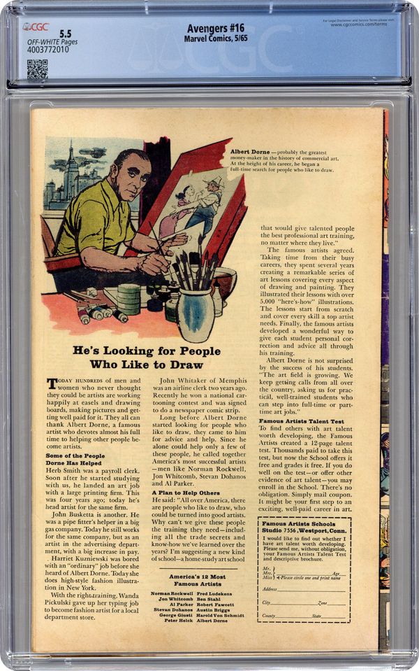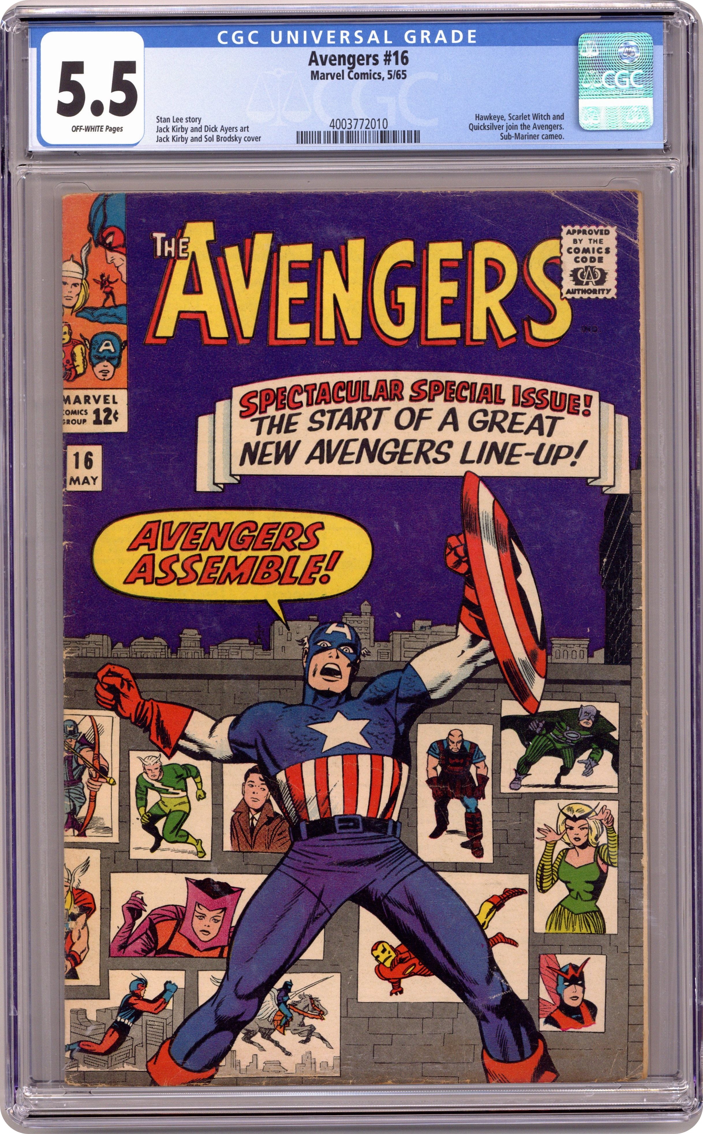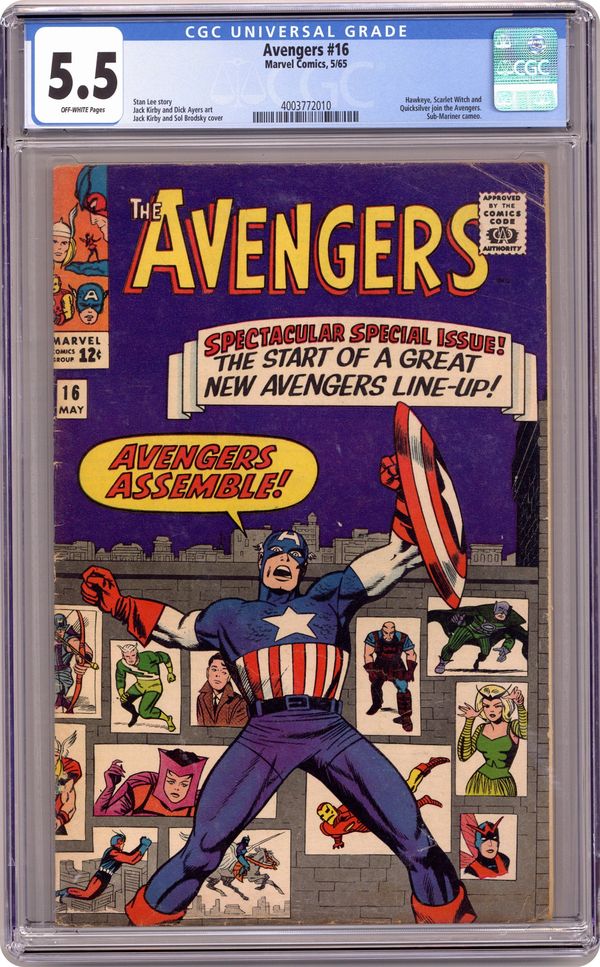 "The Old Order Changeth!" Script by Stan Lee, layouts by Jack Kirby, finished art by Dick Ayers. New line-up for Avengers: Captain America, Thor, Iron Man, Wasp, Giant Man, Hawkeye, Quicksilver, Scarlet Witch, and Rick Jones. First appearance in Avengers of Edwin Jarvis, the butler (in Avengers). Villains: The Melter, the Enchantress, the Executioner, the second Black Knight, and Zemo's Mercenaries (Erik Josten). Guest Appearances by the Sub-Mariner, the Black Widow, the Mole Man, Kang, and Immortus. Cameos by Magneto, Mastermind, the Toad, Beast, Iceman, Angel (on loan from the original X-Men), and Hulk. Reprinted in Marvel Triple Action # 10. Kirby/Sol Brodsky cover. 36 pages, full color. Cover price $0.12. Grade: CGC 5.5 explanation of grade Condition: Used (collectible)