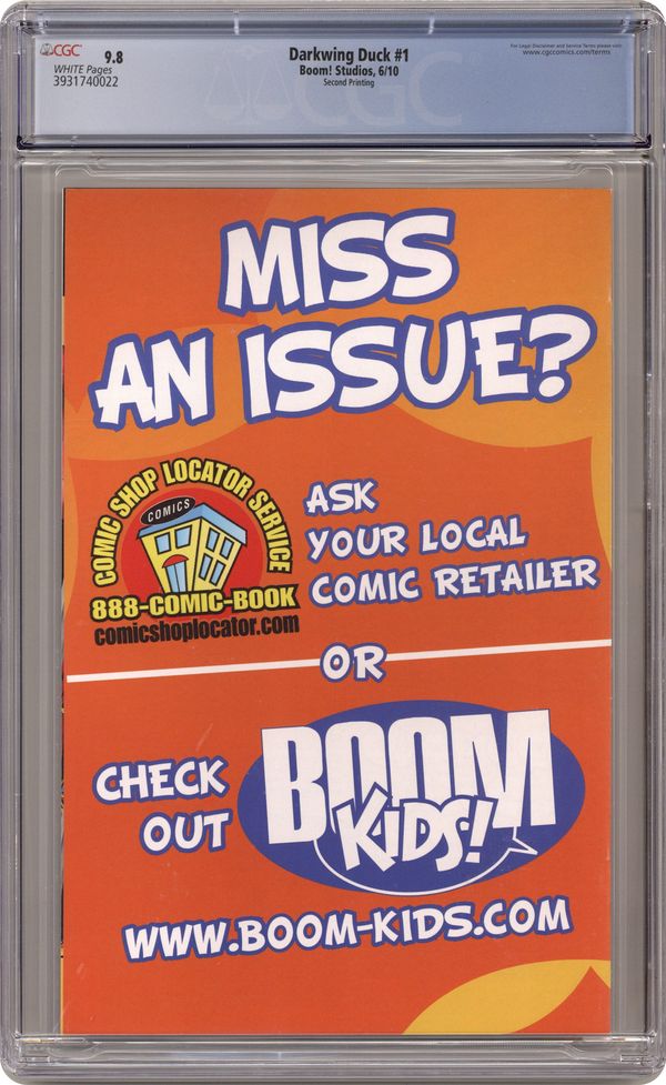 Ended Apr 14 2023 Winning Bid $206 Second Printing Variant Cover by James Silvani. Written by Ian Brill, Art by James Silvani. From BOOM Kids! At last, the second printing of the sold-out first issue - and your chance to get onboard the Darkwing Duck ongoing series! Once St. Canard's greatest protector, Darkwing Duck was known the world over as "The Terror That Flaps In The Night." Now, mysteriously, DW has not been seen or heard from in well over a year... and St. Canard finds that evil is once again on the rise. But when a nefarious plan threatens everyone, Darkwing Duck knows... it's time for the duck knight to return! "LET'S GET DANGEROUS!" with Disney and BOOM! Studios as one of Disney's most beloved characters makes a comeback in his own not-to-be-missed original mini-series! Cover price $3.99. Grade: CGC 9.8 explanation of grade Condition: Used (collectible)