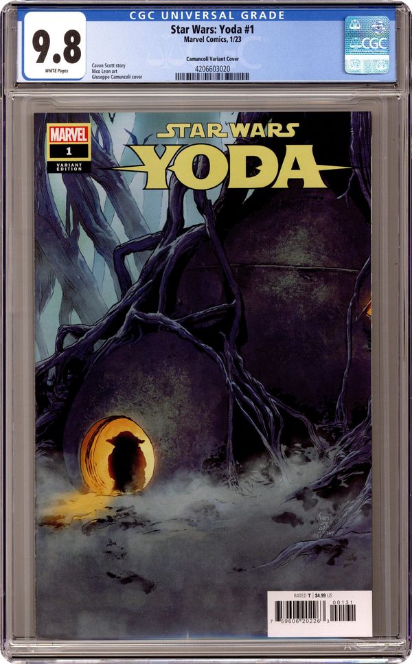 Ended Oct 15 2023 Winning Bid $26 Written by Cavan Scott. Art by Nico Leon. Cover by Giuseppe Camuncoli. ALL-NEW ADVENTURES FOR THE GREATEST JEDI OF ALL TIME! To some, he was a legend. To others, he was a teacher. Now Yoda is all but forgotten, living in exile and haunted by the past. As a strangely familiar voice echoes through the swamps of Dagobah, Yoda must revisit the many lessons he has given over the years, from the days of the High Republic to the chaos of the Clone Wars. In the first of three story arcs, a desperate cry for help reaches the Jedi Council on Coruscant and only Yoda can respond. But how far will he go to protect a community from attack? Cover price $4.99. Grade: CGC 9.8 explanation of grade Condition: Used (collectible)