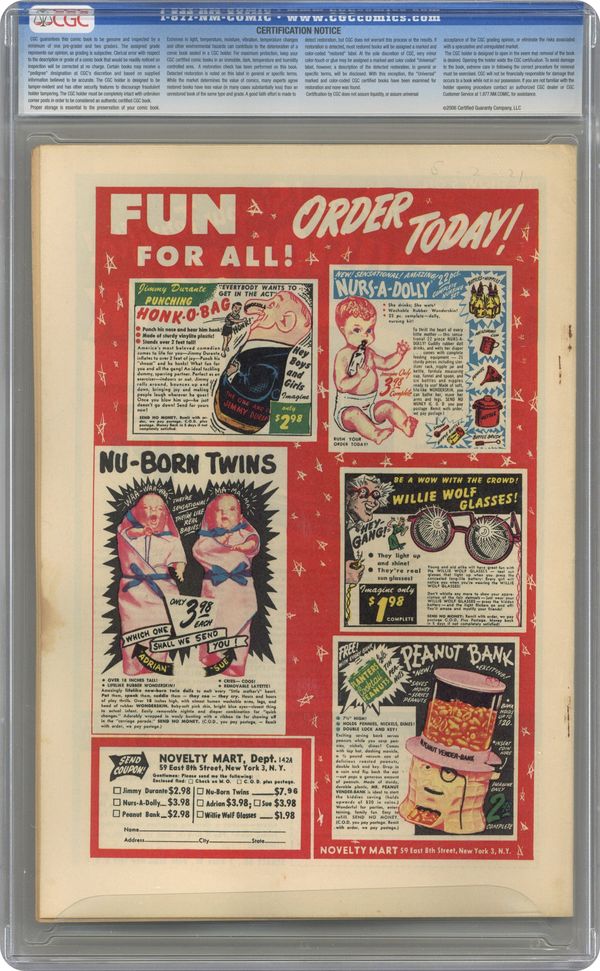 Ended Apr 20 2023 Winning Bid $282 "The Halls of Horror," "The Undying Brain," "Dream of Death" (art by John Belfi), "The Zombie Summons," and "Spook-Buster's Doom." Edited by Richard E. Hughes. Cover by Ogden Whitney. Stories by Emil Gershwin, Al Camy, Edvard Moritz, John Belfi, George Wilhelms, Paul Gattuso, Paul Cooper, and Richard Case. Spine-chilling tales of suspense, horror, and the supernatural—prepare yourself for Adventures into the Unknown! 52 pages, full color. $0.10. Cover price $0.10. Grade: CGC 8.0 explanation of grade Condition: Used (collectible)