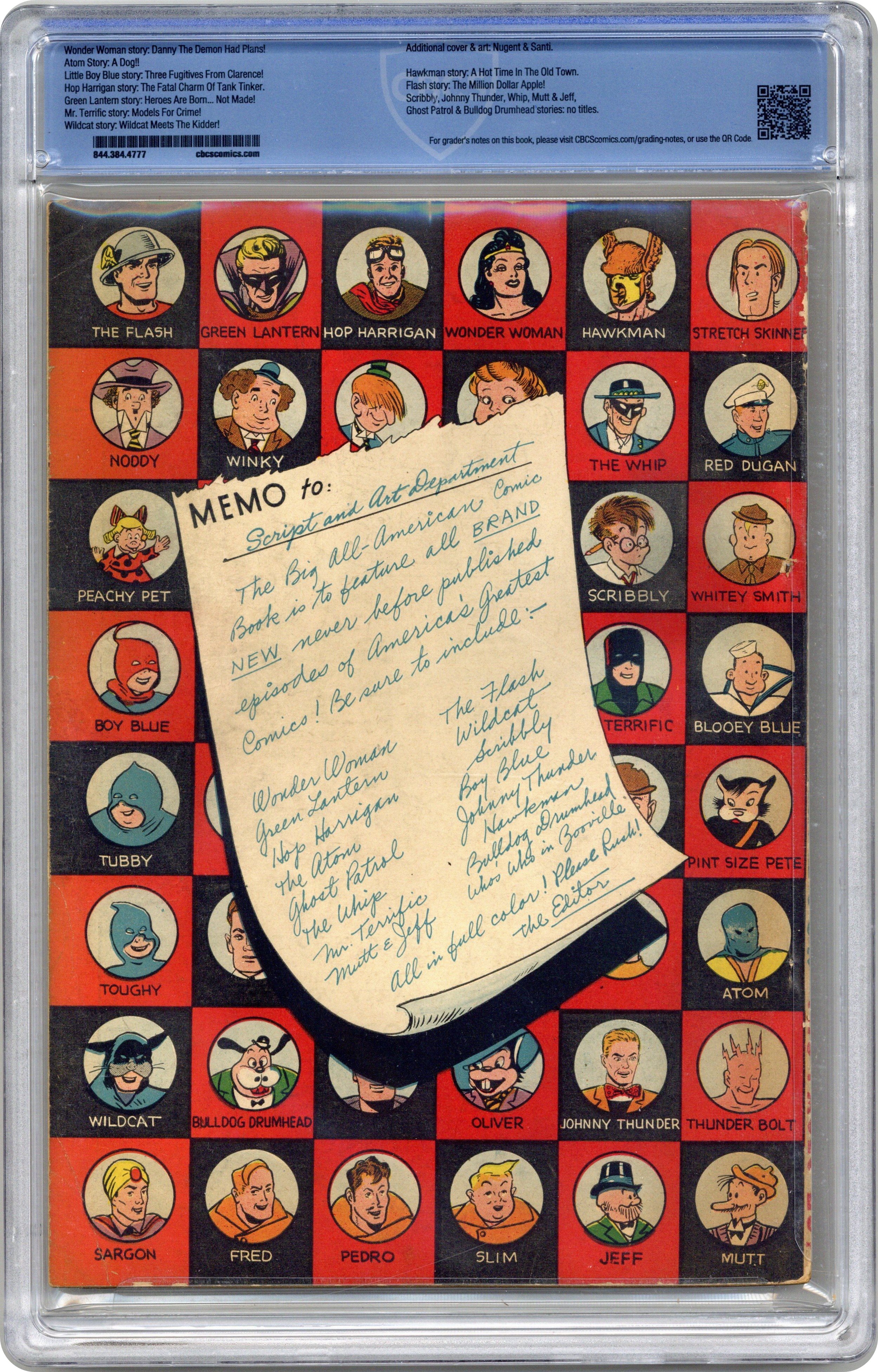 Ended Apr 29 2023 Winning Bid $1,325 "Danny the Demon Had Plans," script by William Moulton Marston (as Charles Moulton), art by Harry G. Peter; Wonder Woman has to work fast to discover evidence that will exonerate Steve from the murder of General Courtney. Mutt & Jeff strips by Al Smith (as Bud Fisher). "The Ten Buck Nut," script and art by Sheldon Mayer; Ma and the kids head out to the racetrack and overhear a man who gets Ma to bet on "a sure thing" --with disastrous results. "Putting on the Dog," script by Joseph Greene, art by Joe Gallagher; Big Mouth Bo-Bo kidnaps a talented dog who has been trained to open doors and arranges for it to be declared homeless so that it will be adopted into a wealthy family. "Three Fugitives from Clarence" starring Little Boy Blue and the Blue Boys, script by Lynn Evans, art by Frank Harry. "Little Peachy Pet Riding Hood," script by Julius Schwartz (as John B. Wentworth), art by Stan Aschmeier (as Stan Josephs); After a rather wild birthday party for Peachy Pet, Johnny Thunder offers to tell her a bedtime story: Little Red Riding Hood. "The Fatal Charm of Tank Tinker" starring Hop Harrigan, script and art by Jon L. Blummer. "Heroes Are Born...Not Made!" starring Green Lantern, script by Alfred Bester, art by Paul Reinman (as Nodell and Reinman); While visiting the city of Baxton, Alan and Doiby visit with the town's bell ringer, who tells them he will never ring the bell again until something heroic is done. "A Hot Time in the Old Town" starring Hawkman, script by Gardner F. Fox, art by Joe Kubert. "The Million Dollar Apple" starring The Flash, script by Gardner F. Fox, art by Everett E. Hibbard. 132 pgs., full color. Cover price $0.25. Grade: CBCS 4.0 explanation of grade Condition: Used (collectible)