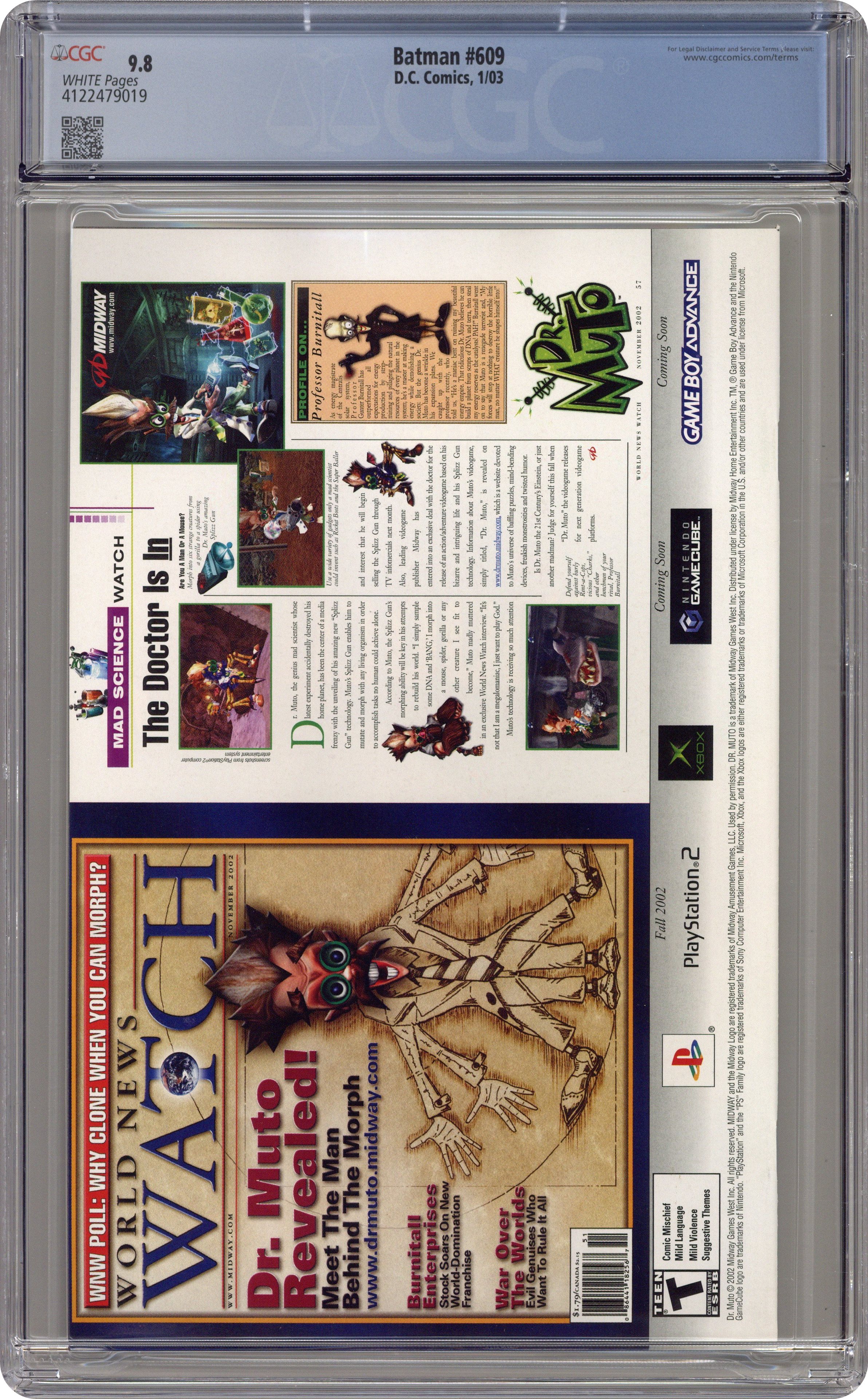 Direct Edition. WRITTEN BY JEPH LOEB; ART AND COVER BY JIM LEE AND SCOTT WILLIAMS In stores November 27. Jeph Loeb & Jim Lee continue their run on BATMAN with Part 2 of the 12-part "Hush." Lying near death, Batman must turn to the least likely person from the Bat family for help: the Huntress! Meanwhile, Catwoman continues to hunt down the mysterious individual responsible for wreaking havoc in their lives ? a path that leads her back to Poison Ivy. 48 Pages, Full Color. Cover price $2.25. Grade: CGC 9.8 explanation of grade Condition: Used (collectible)