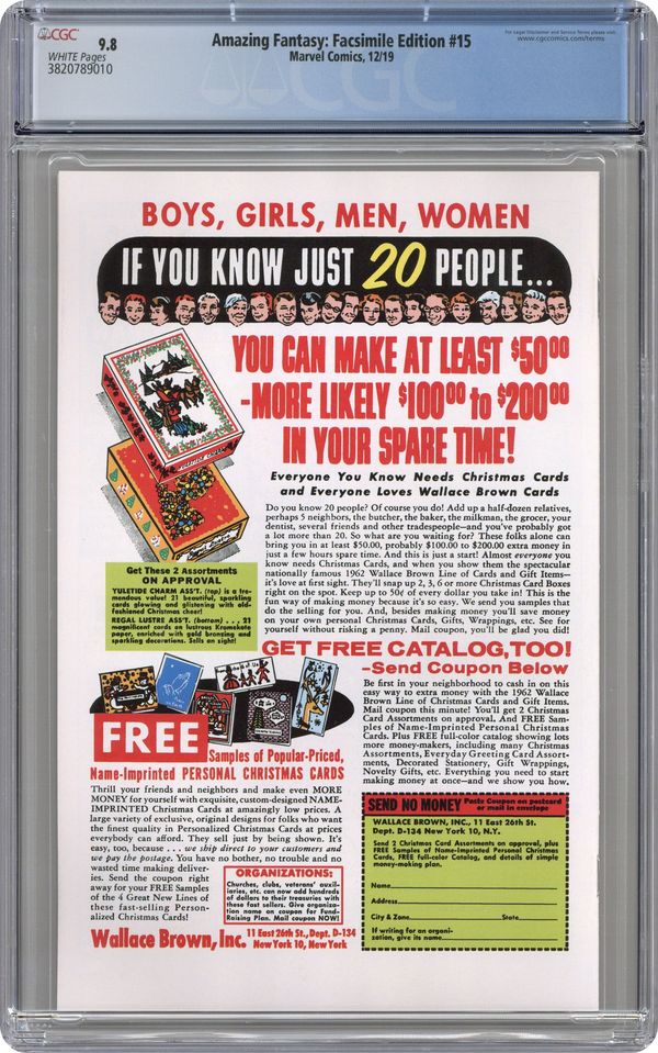 Written by Stan Lee. Art by Steve Ditko. Cover by Jack Kirby. The landmark, industry-changing issue that introduced the Amazing Spider-Man! When high school wallflower Peter Parker is bitten by a radioactive spider, his life is transformed - first for the better, then for the worse! With his new array of arachnid abilities - including speed, strength, agility and, thanks to his scientific know-how, spinning webs - Peter seeks fame as the costumed celebrity called Spider-Man! But his cavalier attitude soon comes back to haunt him, and shatter the lives of his beloved Uncle Ben and Aunt May! Peter Parker is about to learn a powerful lesson, one that has never been taught better than by Stan Lee and Steve Ditko: With great power there must also come great responsibility! It's one of the all-time great Marvel comic books, boldly re-presented in its original form, ads and all! Reprinting AMAZING FANTASY (1962) #15. 32 pages, full color. All Ages Cover price $3.99. Grade: CGC 9.8 explanation of grade Condition: Used (collectible)