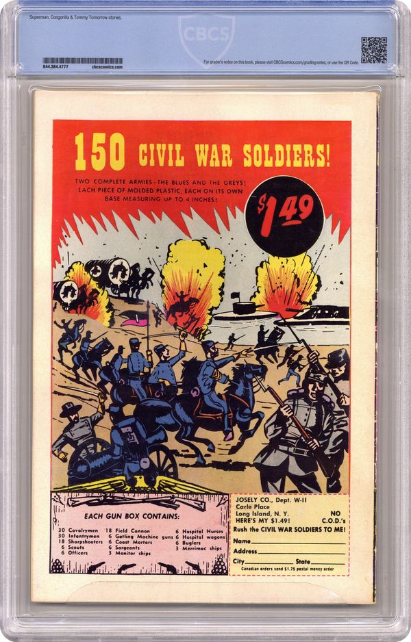 Ended Apr 11 2023 Winning Bid $88 Cover pencils by Curt Swan, inks by Stan Kaye. "The Kryptonite Man!", script by Otto Binder, art by Al Plastino; Luthor takes a liquid kryptonite serum which makes it impossible for Superman to get near him; Superman makes a lead suit to protect himself, but Luthor has discovered a way to turn lead into glass. -page Casey the Cop story by Henry Boltinoff. Supermen of America ad. "The Man-Ape's Mountain Mission," script by Robert Bernstein, art by Howard Sherman; As Congorilla goes on a dangerous mission to rescue some plane crash survivors, the body of Congo Bill is locked in a shack which is about to be blown up. One-page Varsity Vic story by Henry Boltinoff. "The Gambling Asteroid" starring Tommy Tomorrow, script by Otto Binder, art by Jim Mooney. One-page Private Pete story by Henry Boltinoff. 36 Pages, Full Color. $.10 Cover price $0.10. Grade: CBCS 6.5 explanation of grade Condition: Used (collectible)