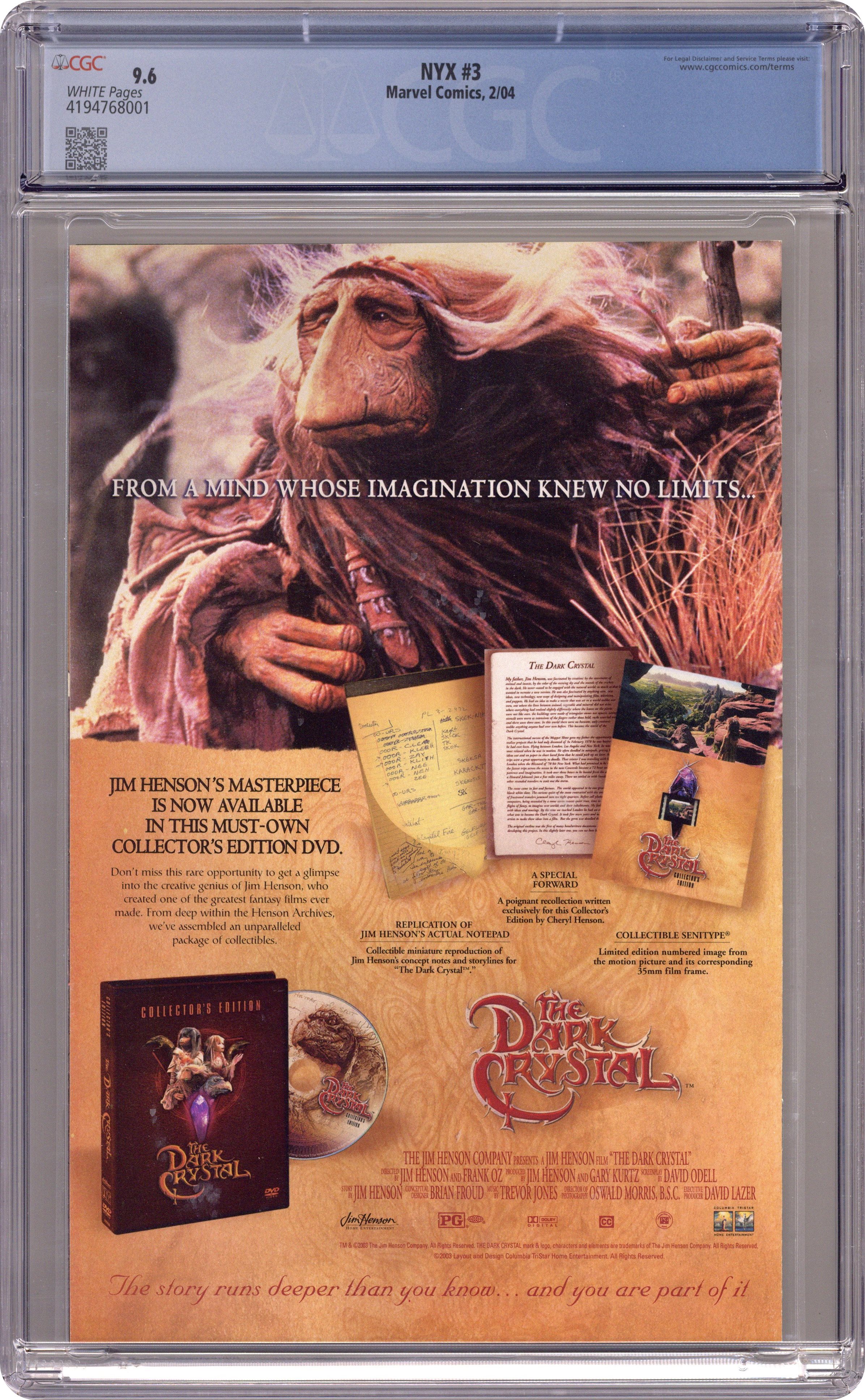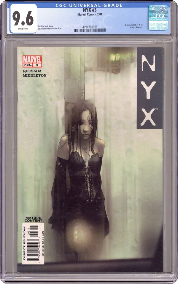 1st appearance of X-23, a female mutant clone of Wolverine. Written by JOE QUESADA Cover & pencils by JOSHUA MIDDLETON As if one down-on-her-luck runaway teenage mutant wasn't enough, there's some new genetically mutated blood headed for New York City's Lower East Side. Could this new face be related to a certain member of Marvel's merriest band of mutants? In the latest issues of the edgy new series, it's not just the stakes that will be raised. 32 PGS./MARVEL PSR+ Cover price $2.99. Grade: CGC 9.6 explanation of grade Condition: Used (collectible)